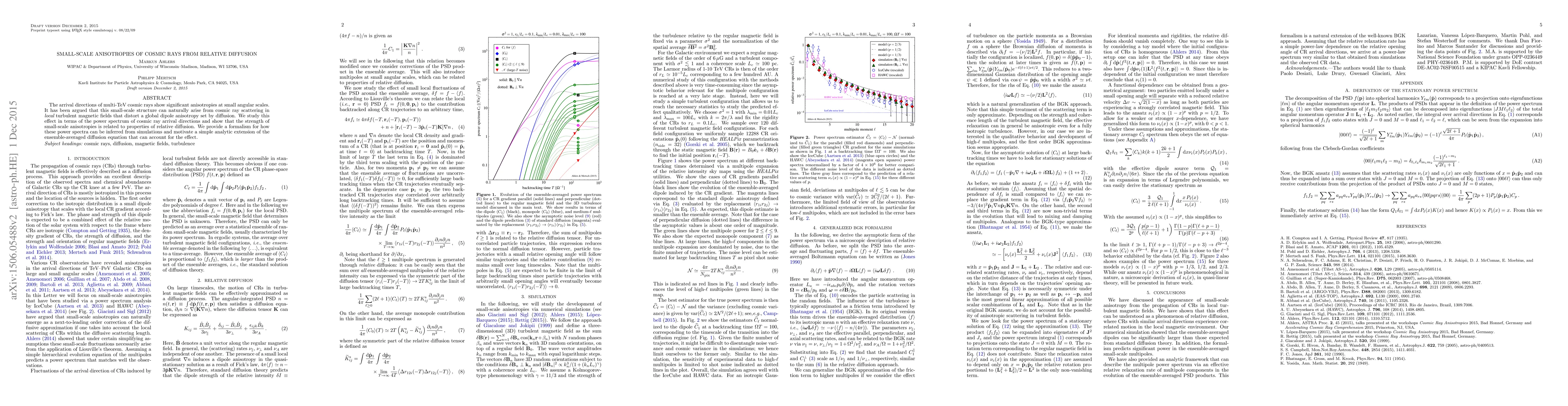 This paper investigates the small-scale anisotropies in the arrival directions of multi-TeV cosmic rays, attributing them to scattering in local turbulent magnetic fields. It proposes a formalism linking these anisotropies to relative diffusion properties and provides an analytic extension of the diffusion equation to model these effects.