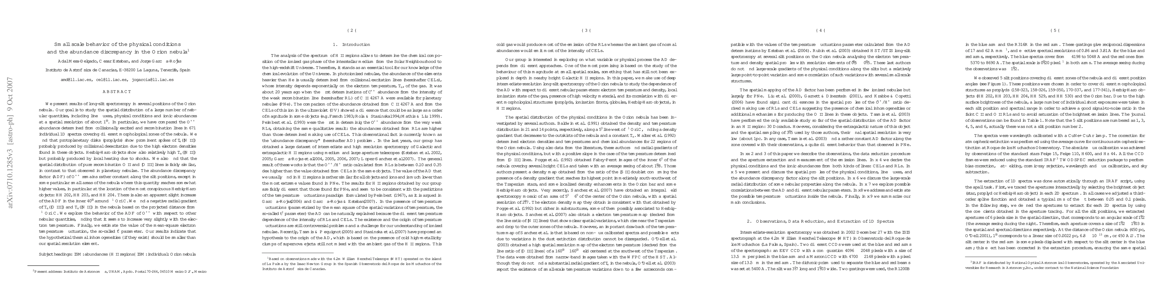 This study uses long-slit spectroscopy to investigate the Orion nebula's small-scale physical conditions and ionic abundances, revealing spikes in T([N II]) in proplyds due to high electron densities and high T([N II]) in Herbig-Haro objects from shock heating. The abundance discrepancy factor (ADF) of O^{++} shows slight variations, notably near HH 202, HH 203, and HH 204, and a negative radial gradient of T([O III]) and T([N II]) from theta^1 Ori C.