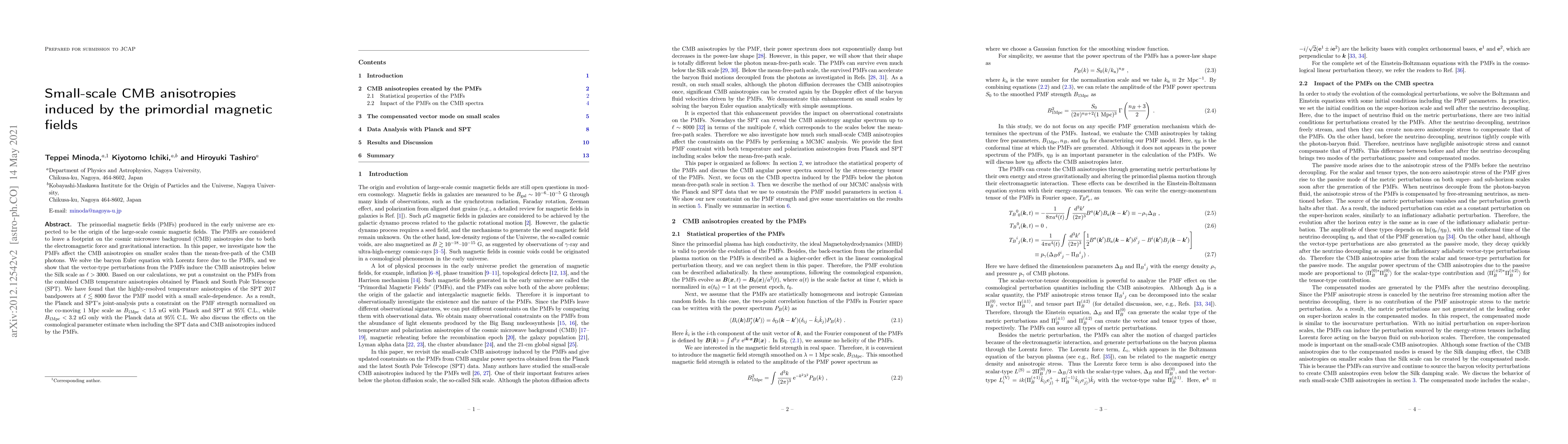 This paper investigates the influence of primordial magnetic fields (PMFs) on small-scale cosmic microwave background (CMB) anisotropies, showing that vector-type perturbations from PMFs induce anisotropies below the Silk scale. The joint analysis of Planck and South Pole Telescope (SPT) data constrains the PMF spectral index to $n_B<-1.14$ at 95% confidence level, significantly tighter than the Planck-only constraint.