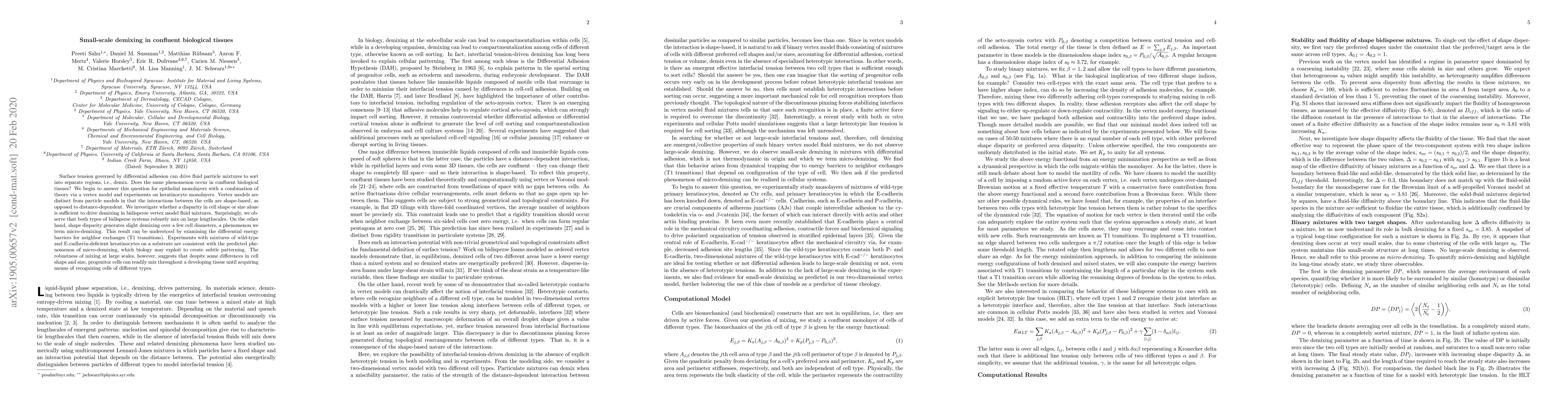 Confluent biological tissues can demix due to differences in cell shape or size, leading to micro-demixing over short distances, but can also mix robustly at large scales until cells acquire distinct characteristics.