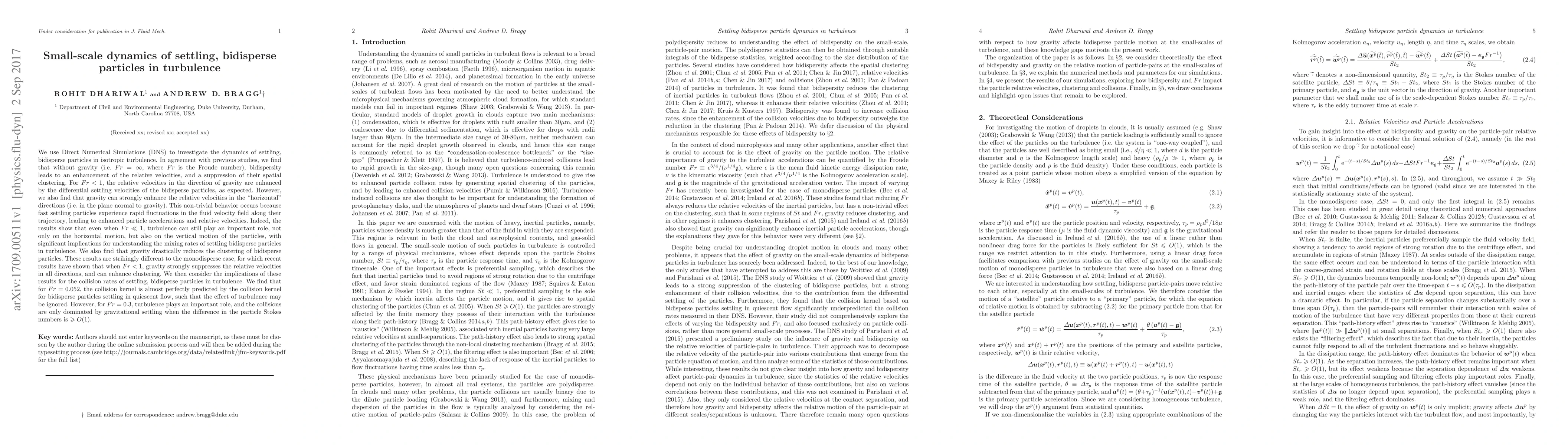 This study uses Direct Numerical Simulations to explore the dynamics of settling, bidisperse particles in turbulence, finding that gravity significantly enhances relative velocities in both horizontal and vertical directions, contrary to the monodisperse case. The results suggest turbulence plays a crucial role in the motion and mixing of bidisperse particles, with implications for collision rates and mixing efficiency.