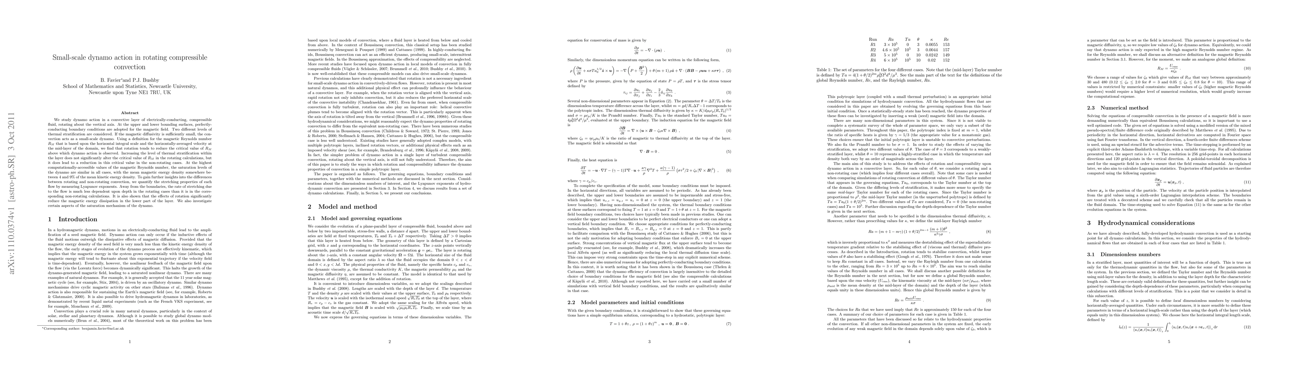 We study dynamo action in a convective layer of electrically-conducting, compressible fluid, rotating about the vertical axis. At the upper and lower bounding surfaces, perfectly-conducting boundary conditions are adopted for the magnetic field. Two different levels of thermal stratification are considered. If the magnetic diffusivity is sufficiently small, the convection acts as a small-scale dynamo. Using a definition for the magnetic Reynolds number $R_M$ that is based upon the horizontal integral scale and the horizontally-averaged velocity at the mid-layer of the domain, we find that rotation tends to reduce the critical value of $R_M$ above which dynamo action is observed. Increasing the level of thermal stratification within the layer does not significantly alter the critical value of $R_M$ in the rotating calculations, but it does lead to a reduction in this critical value in the non-rotating cases. At the highest computationally-accessible values of the magnetic Reynolds number, the saturation levels of the dynamo are similar in all cases, with the mean magnetic energy density somewhere between 4 and 9% of the mean kinetic energy density. To gain further insights into the differences between rotating and non-rotating convection, we quantify the stretching properties of each flow by measuring Lyapunov exponents. Away from the boundaries, the rate of stretching due to the flow is much less dependent upon depth in the rotating cases than it is in the corresponding non-rotating calculations. It is also shown that the effects of rotation significantly reduce the magnetic energy dissipation in the lower part of the layer. We also investigate certain aspects of the saturation mechanism of the dynamo.