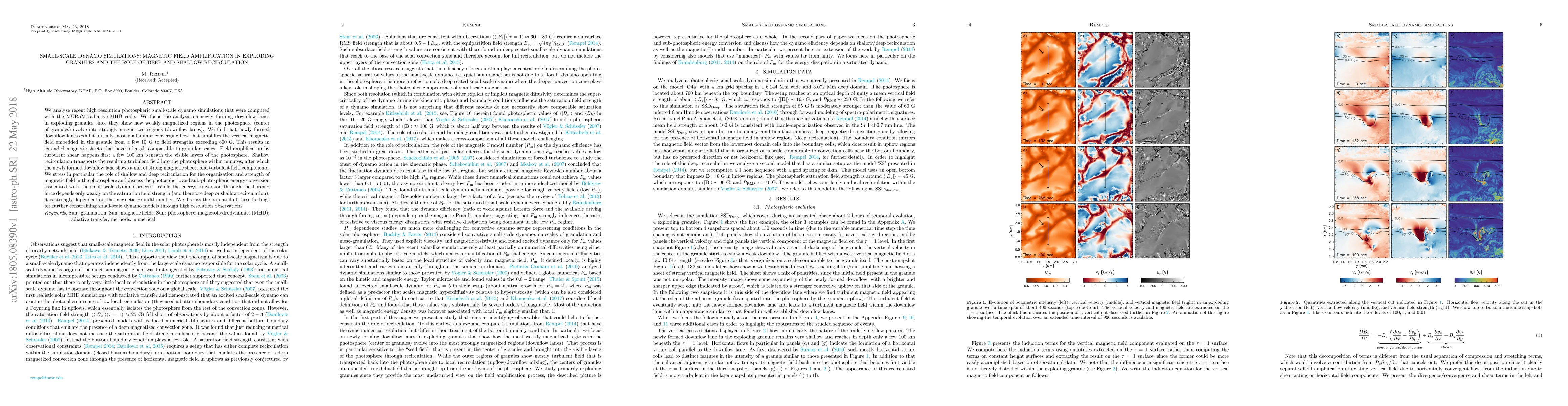 The paper analyzes high-resolution simulations of small-scale dynamos in the photosphere using the MURaM code. It finds that newly formed downflow lanes in granules amplify vertical magnetic fields from weak to strong, creating extended magnetic sheets. Shallow and deep recirculation play crucial roles in transporting and organizing these magnetic fields. The energy conversion process is influenced by the magnetic Prandtl number, with implications for constraining small-scale dynamo models via high-resolution observations.