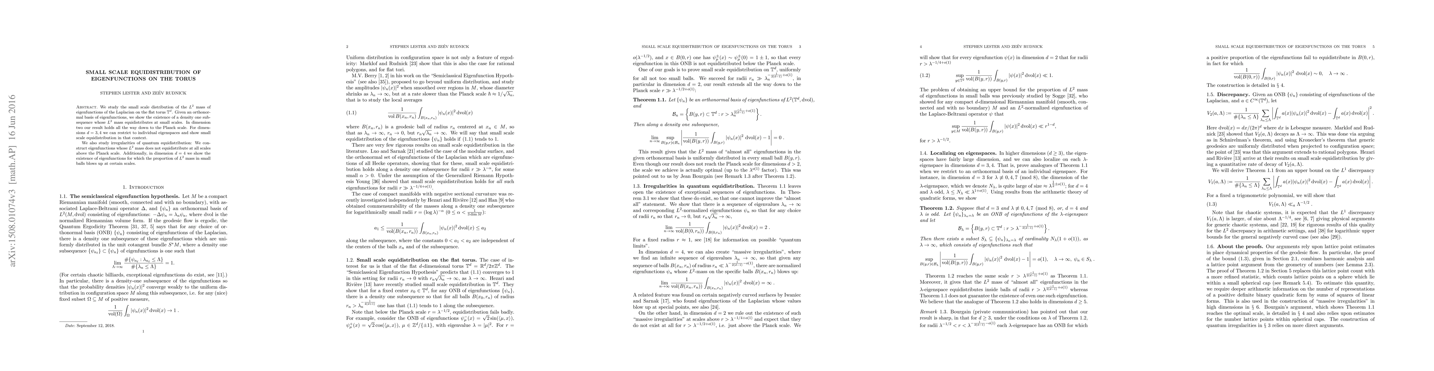 This paper investigates the small scale distribution of eigenfunctions of the Laplacian on the torus, showing that a density one subsequence of eigenfunctions equidistributes their $L^2$ mass at small scales, particularly in two dimensions down to the Planck scale. It also explores cases where eigenfunctions fail to equidistribute at larger scales, especially in dimensions three and four.