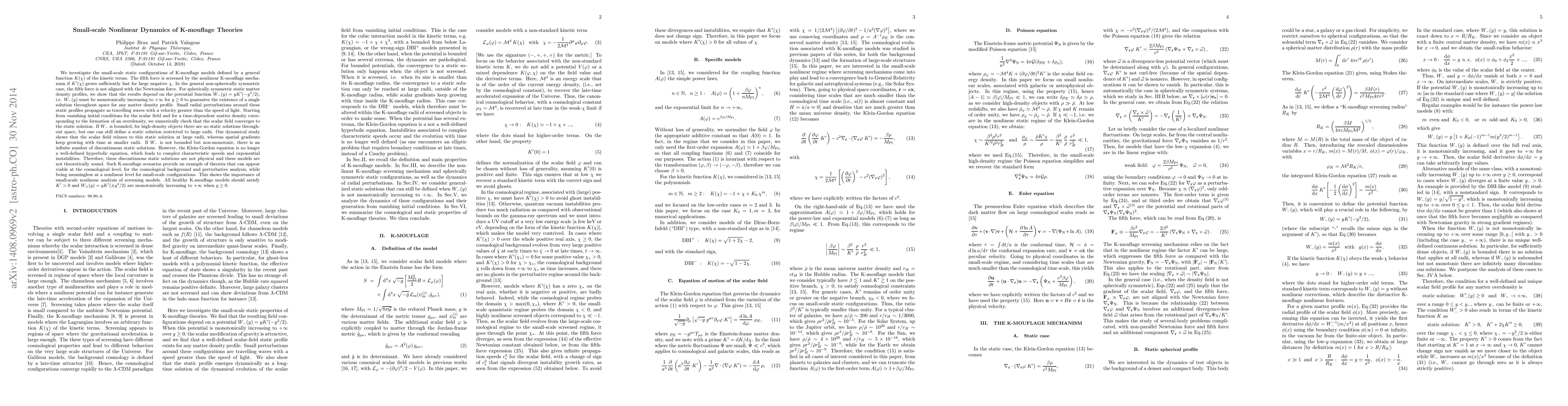 This paper explores the small-scale static configurations of K-mouflage theories, revealing that the fifth force is screened nonlinearly. It finds that for spherically symmetric profiles, a monotonically increasing potential function is necessary for a single static solution, while small perturbations propagate faster than light.