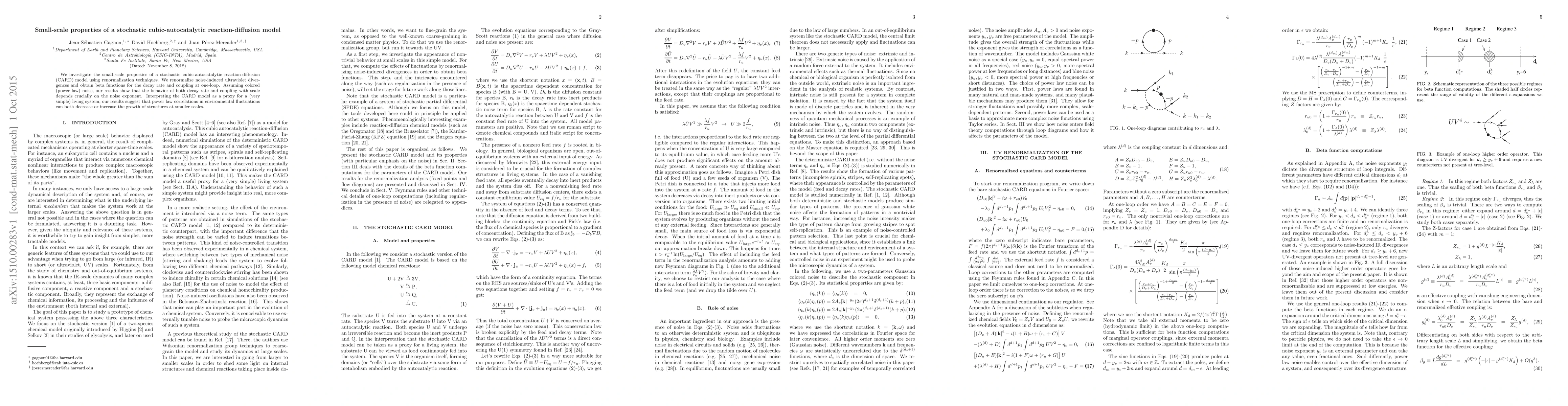 This paper employs renormalization techniques to study the small-scale properties of a stochastic cubic-autocatalytic reaction-diffusion model, revealing that noise-induced ultraviolet divergences affect the decay rate and coupling. The findings suggest that power law noise correlations can either enhance or inhibit structure growth at smaller scales.