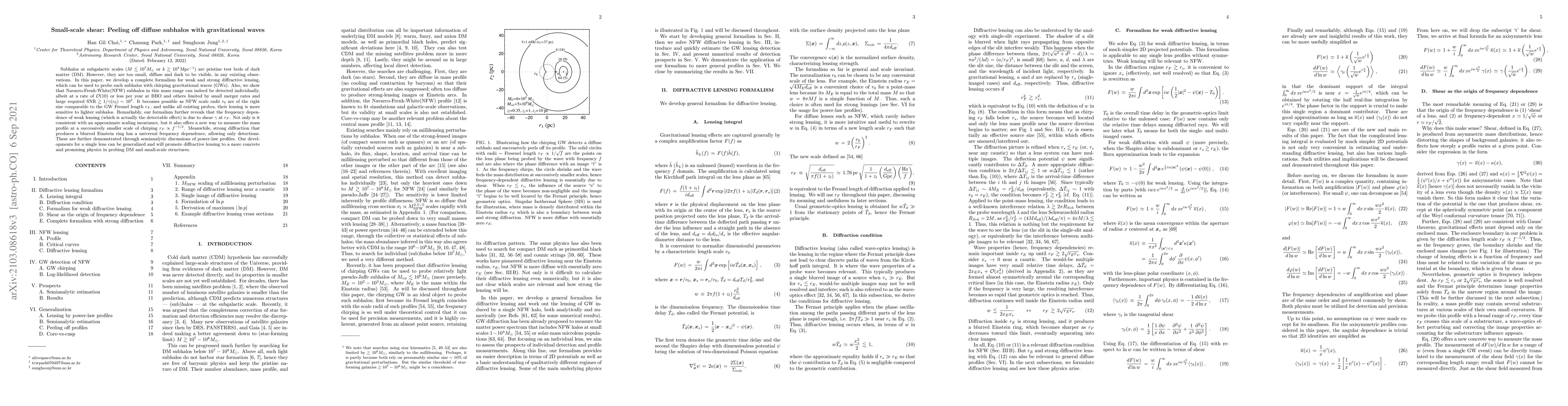 Subhalos at subgalactic scales ($M\lesssim 10^7 M_\odot$ or $k\gtrsim 10^3 \,{\rm Mpc}^{-1}$) are pristine test beds of dark matter (DM). However, they are too small, diffuse and dark to be visible, in any existing observations. In this paper, we develop a complete formalism for weak and strong diffractive lensing, which can be used to probe such subhalos with chirping gravitational waves (GWs). Also, we show that Navarro-Frenk-White(NFW) subhalos in this mass range can indeed be detected individually, albeit at a rate of ${\cal O}(10)$ or less per year at BBO and others limited by small merger rates and large required SNR $\gtrsim 1/\gamma(r_0) \sim 10^3$. It becomes possible as NFW scale radii $r_0$ are of the right size comparable to the GW Fresnel length $r_F$, and unlike all existing probes, their lensing is more sensitive to lighter subhalos. Remarkably, our formalism further reveals that the frequency dependence of weak lensing (which is actually the detectable effect) is due to shear $\gamma$ at $r_F$. Not only is it consistent with an approximate scaling invariance, but it also offers a new way to measure the mass profile at a successively smaller scale of chirping $r_F \propto f^{-1/2}$. Meanwhile, strong diffraction that produces a blurred Einstein ring has a universal frequency dependence, allowing only detections. These are further demonstrated through semianalytic discussions of power-law profiles. Our developments for a single lens can be generalized and will promote diffractive lensing to a more concrete and promising physics in probing DM and small-scale structures.
