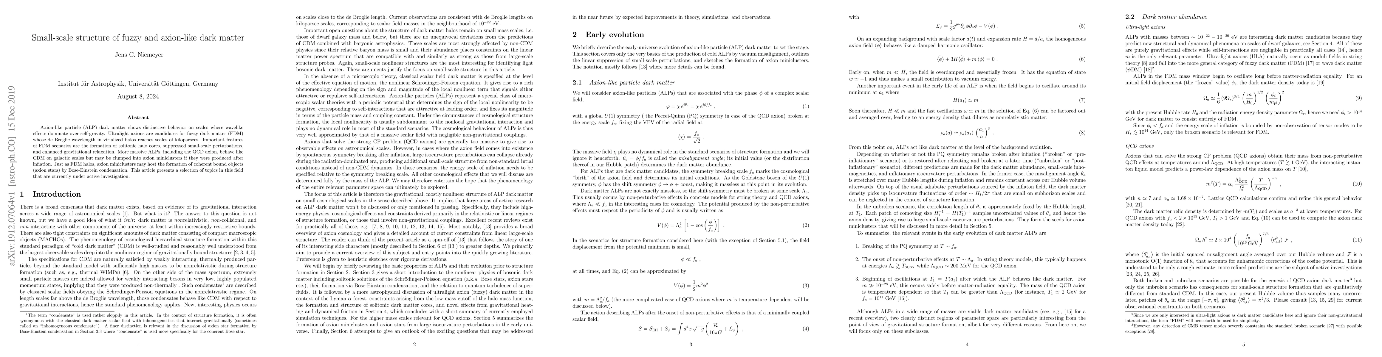 Axion-like particle (ALP) dark matter shows distinctive behavior on scales where wavelike effects dominate over self-gravity. Ultralight axions are candidates for fuzzy dark matter (FDM) whose de Broglie wavelength in virialized halos reaches scales of kiloparsecs. Important features of FDM scenarios are the formation of solitonic halo cores, suppressed small-scale perturbations, and enhanced gravitational relaxation. More massive ALPs, including the QCD axion, behave like CDM on galactic scales but may be clumped into axion miniclusters if they were produced after inflation. Just as FDM halos, axion miniclusters may host the formation of coherent bound objects (axion stars) by Bose-Einstein condensation. This article presents a selection of topics in this field that are currently under active investigation.