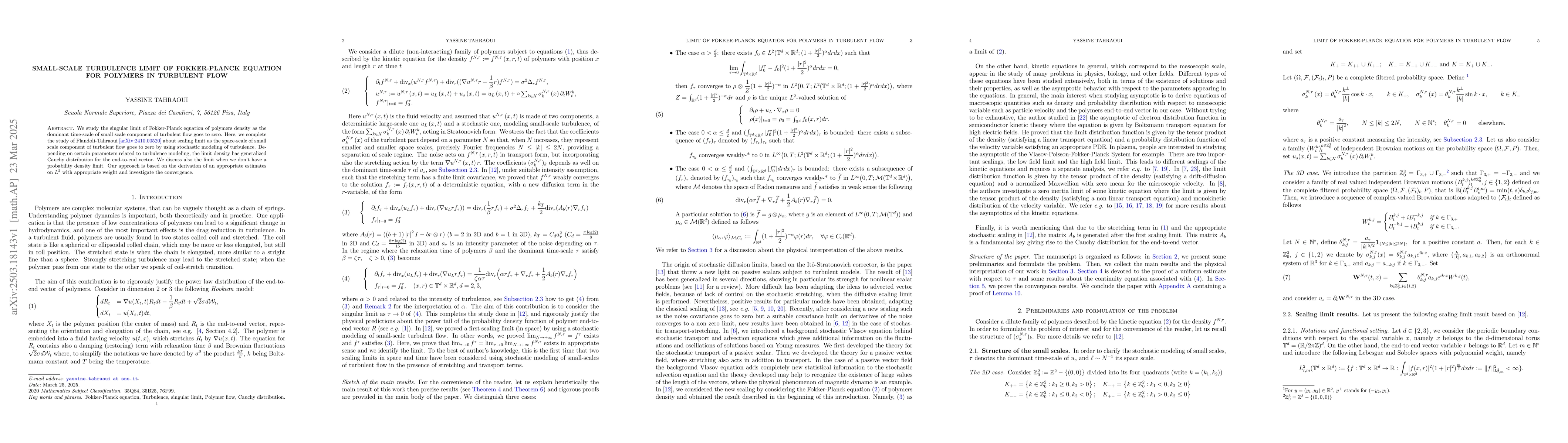 The research employs stochastic modeling of turbulence to study the singular limit of the Fokker-Planck equation for polymer density as the dominant time-scale of small-scale turbulent flow components approaches zero.