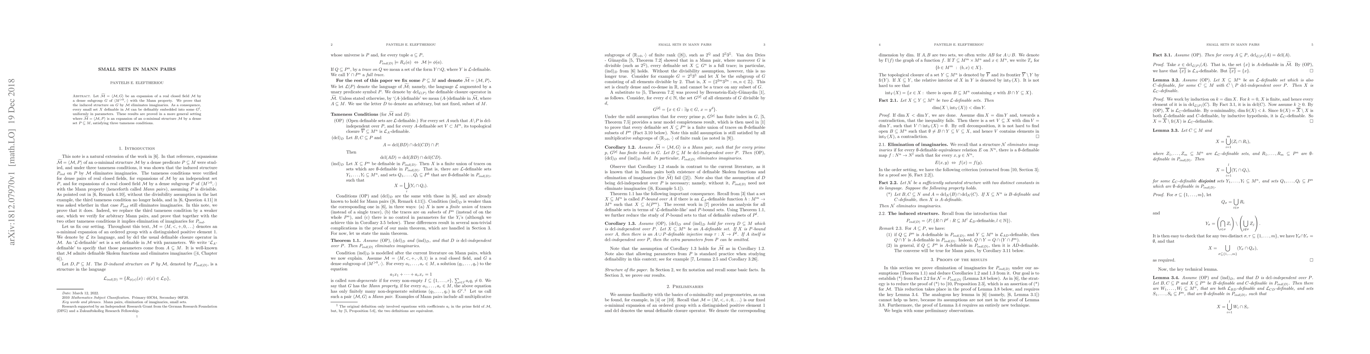 Let $\widetilde{\mathcal M}=\langle \mathcal M, G\rangle$ be an expansion of a real closed field $\mathcal M$ by a dense subgroup $G$ of $\langle M^{>0}, \cdot\rangle$ with the Mann property. We prove that the induced structure on $G$ by $\mathcal M$ eliminates imaginaries. As a consequence, every small set $X$ definable in $\mathcal M$ can be definably embedded into some $G^l$, uniformly in parameters. These results are proved in a more general setting, where $\widetilde{\mathcal M}=\langle \mathcal M, P\rangle$ is an expansion of an o-minimal structure $\mathcal M$ by a dense set $P\subseteq M$, satisfying three tameness conditions.
