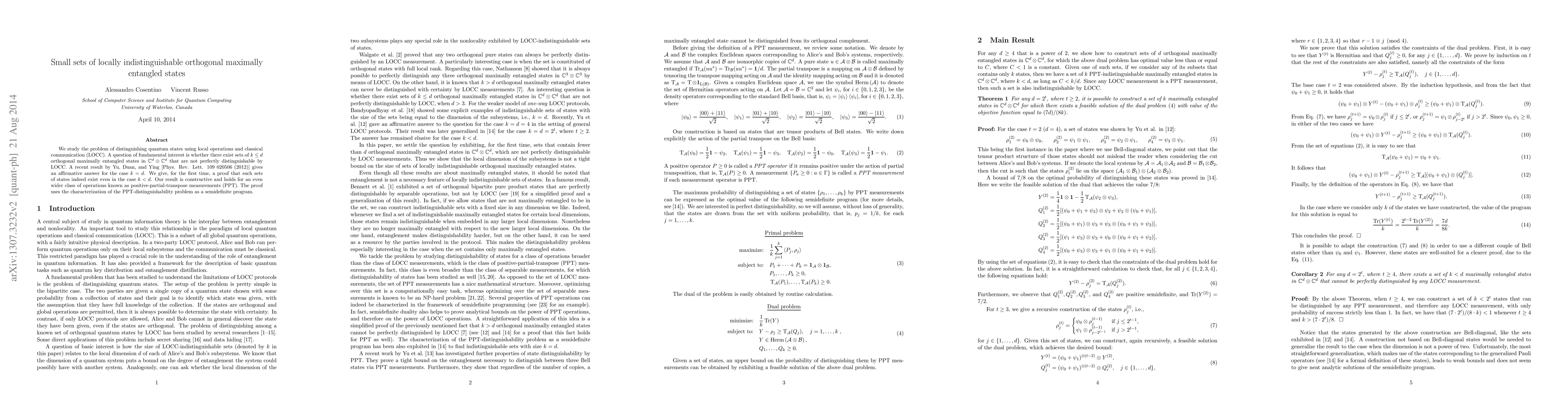 This paper proves the existence of small sets of orthogonal maximally entangled states in $\mathbb{C}^{d}\otimes\mathbb{C}^{d}$ that cannot be perfectly distinguished using local operations and classical communication (LOCC), extending previous results to cases where $k < d$. The proof leverages positive-partial-transpose measurements and characterizes the distinguishability problem as a semidefinite program.