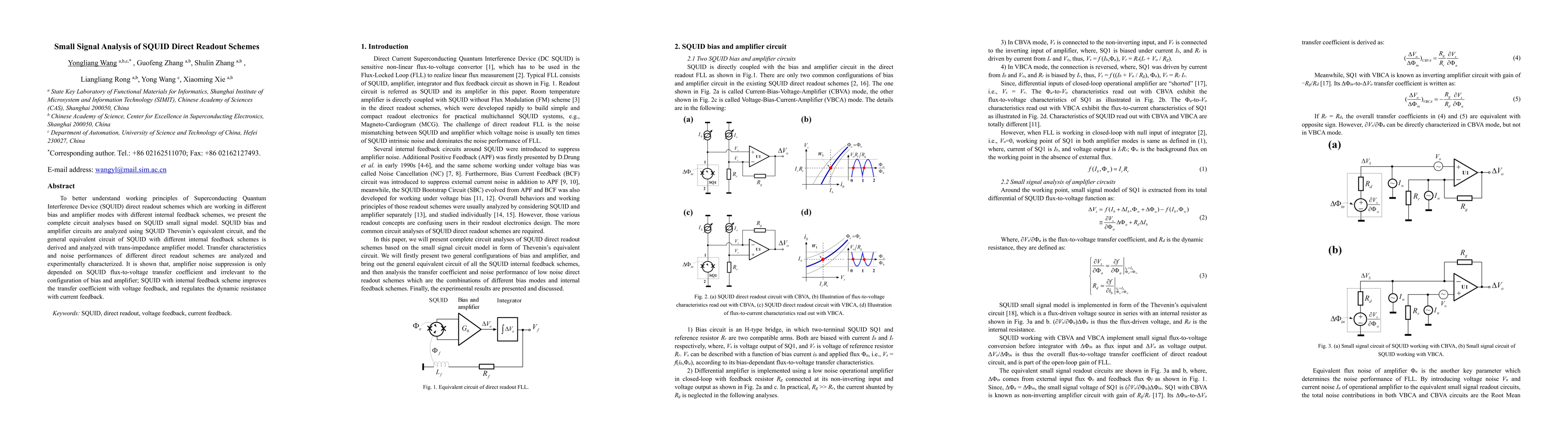 This paper provides a detailed small-signal analysis of SQUID direct readout schemes, revealing that amplifier noise suppression depends on the SQUID flux-to-voltage transfer coefficient rather than the readout configuration. It also demonstrates that internal feedback schemes enhance the transfer coefficient and regulate dynamic resistance.