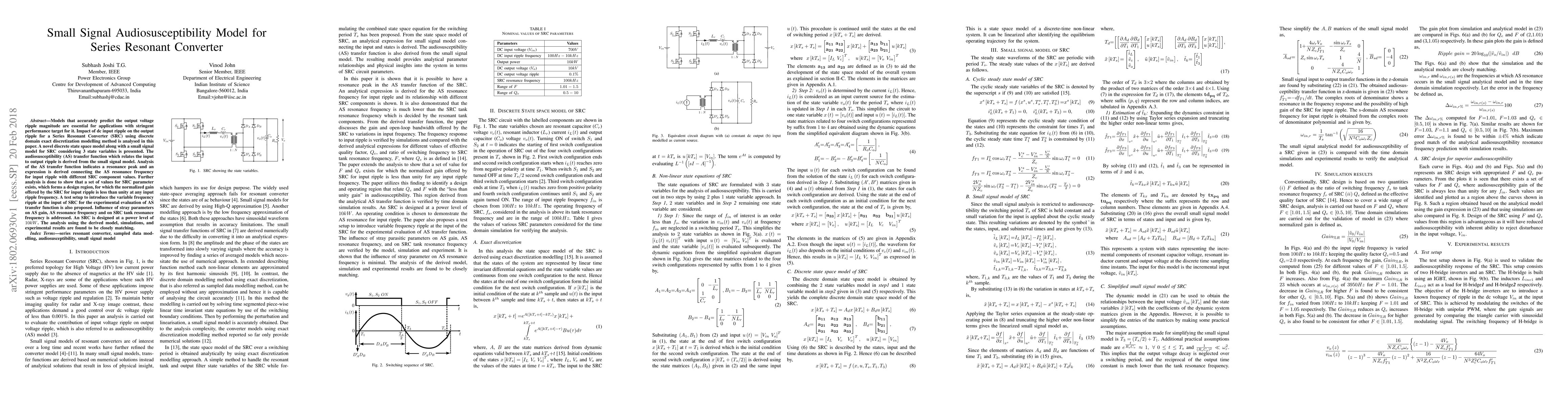 Models that accurately predict the output voltage ripple magnitude are essential for applications with stringent performance target for it. Impact of dc input ripple on the output ripple for a Series Resonant Converter (SRC) using discrete domain exact discretization modelling method is analysed in this paper. A novel discrete state space model along with a small signal model for SRC considering 3 state variables is presented. The audiosusceptibility (AS) transfer function which relates the input to output ripple is derived from the small signal model. Analysis of the AS transfer function indicates a resonance peak and an expression is derived connecting the AS resonance frequency for input ripple with different SRC component values. Further analysis is done to show that a set of values for SRC parameter exists, which forms a design region, for which the normalized gain offered by the SRC for input ripple is less than unity at any input ripple frequency. A test setup to introduce the variable frequency ripple at the input of SRC for the experimental evaluation of AS transfer function is also proposed. Influence of stray parameters on AS gain, AS resonance frequency and on SRC tank resonance frequency is addressed. An SRC is designed at a power level of 10kW. The analysis using the derived model, simulations, and experimental results are found to be closely matching.