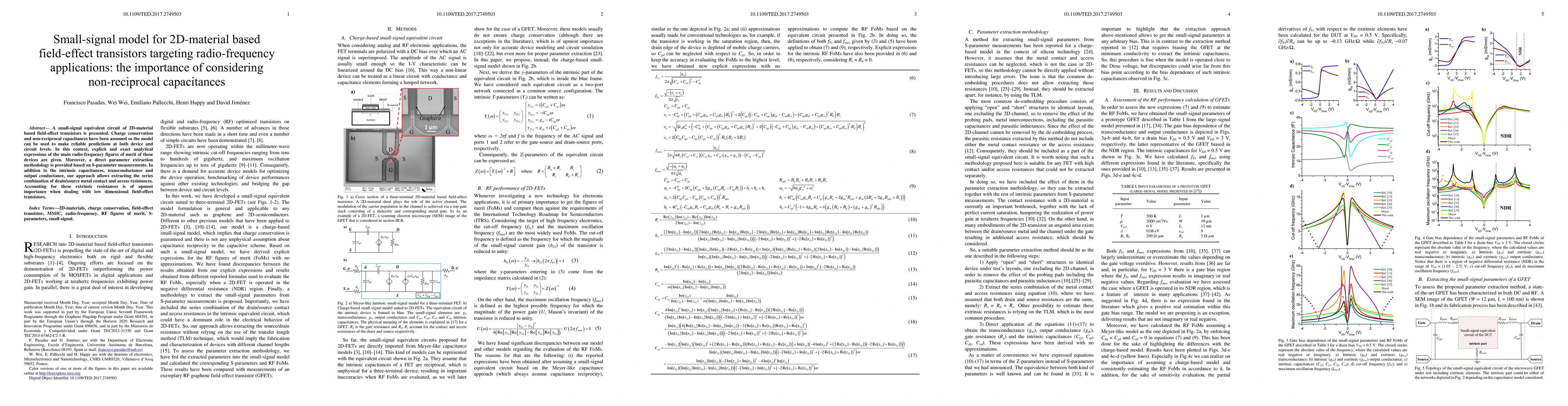 This paper presents a small-signal equivalent circuit model for 2D-material based field-effect transistors, emphasizing the importance of non-reciprocal capacitances for accurate radio-frequency predictions. It provides analytical expressions for key figures of merit and a methodology for parameter extraction from S-parameter measurements, including extrinsic resistances.