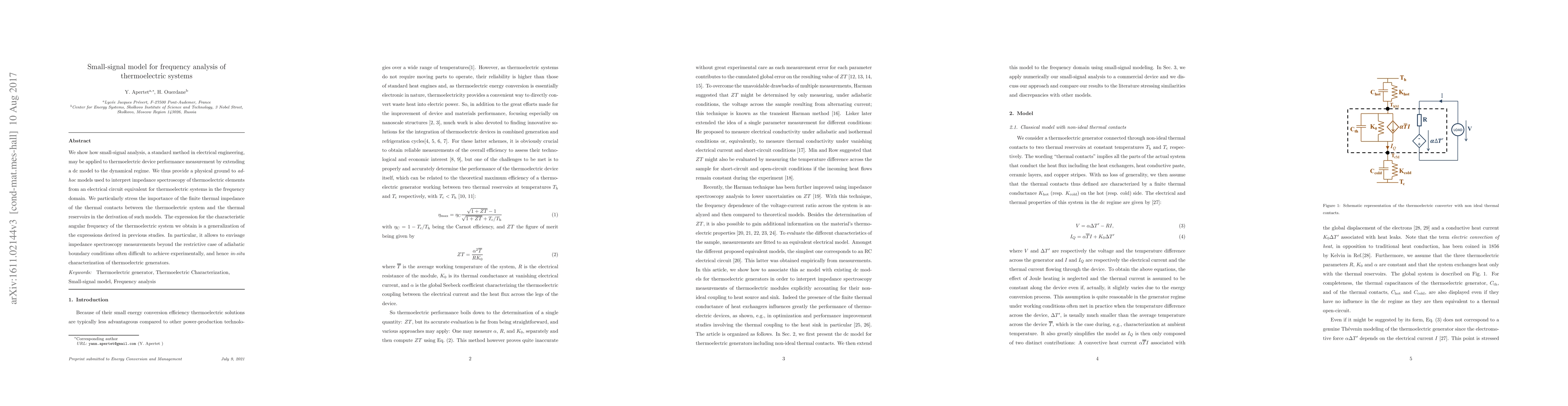 We show how small-signal analysis, a standard method in electrical engineering, may be applied to thermoelectric device performance measurement by extending a dc model to the dynamical regime. We thus provide a physical ground to \textit{ad-hoc} models used to interpret impedance spectroscopy of thermoelectric elements from an electrical circuit equivalent for thermoelectric systems in the frequency domain. We particularly stress the importance of the finite thermal impedance of the thermal contacts between the thermoelectric system and the thermal reservoirs in the derivation of such models. The expression for the characteristic angular frequency of the thermoelectric system we obtain is a generalization of the expressions derived in previous studies. In particular, it allows to envisage impedance spectroscopy measurements beyond the restrictive case of adiabatic boundary conditions often difficult to achieve experimentally, and hence \emph{in-situ} characterization of thermoelectric generators.