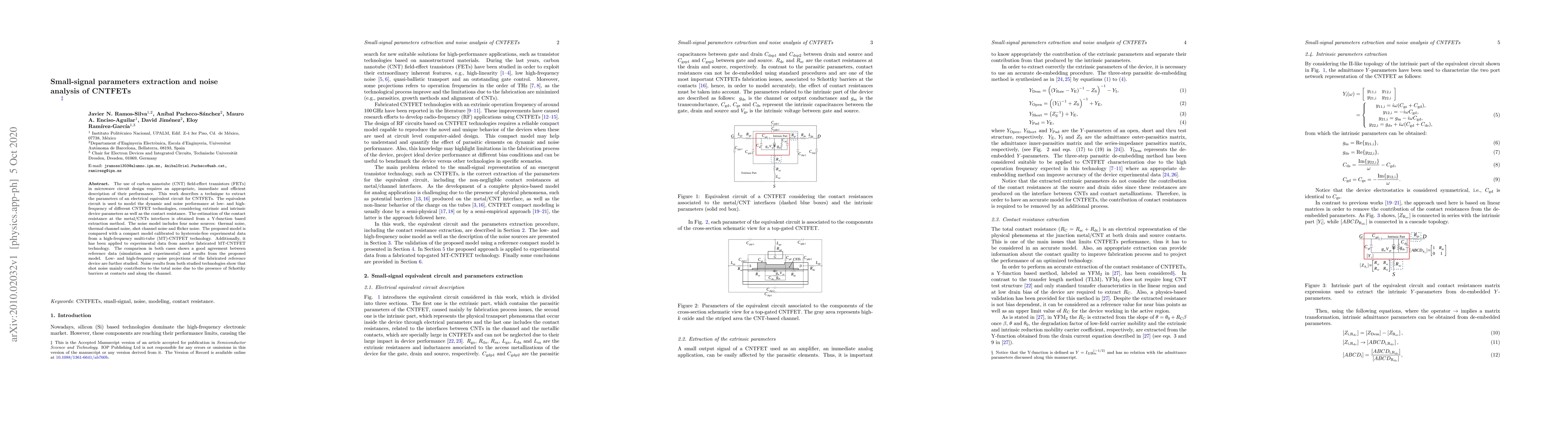 The use of carbon nanotube (CNT) field-effect transistors (FETs) in microwave circuit design requires an appropriate, immediate and efficient description of their performance. This work describes a technique to extract the parameters of an electrical equivalent circuit for CNTFETs. The equivalent circuit is used to model the dynamic and noise performance at low- and high-frequency of different CNTFET technologies, considering extrinsic and intrinsic device parameters as well as the contact resistance. The estimation of the contact resistance at the metal/CNTs interfaces is obtained from a Y-function based extraction method. The noise model includes four noise sources: thermal noise, thermal channel noise, shot channel noise and flicker noise. The proposed model is compared with a compact model calibrated to hysteresis-free experimental data from a high-frequency multi-tube (MT)-CNTFET technology. Additionally, it has been applied to experimental data from another fabricated MT-CNTFET technology. The comparison in both cases shows a good agreement between reference data (simulation and experimental) and results from the proposed model. Low- and high-frequency noise projections of the fabricated reference device are further studied. Noise results from both studied technologies show that shot noise mainly contributes to the total noise due to the presence of Schottky barriers at contacts and along the channel.