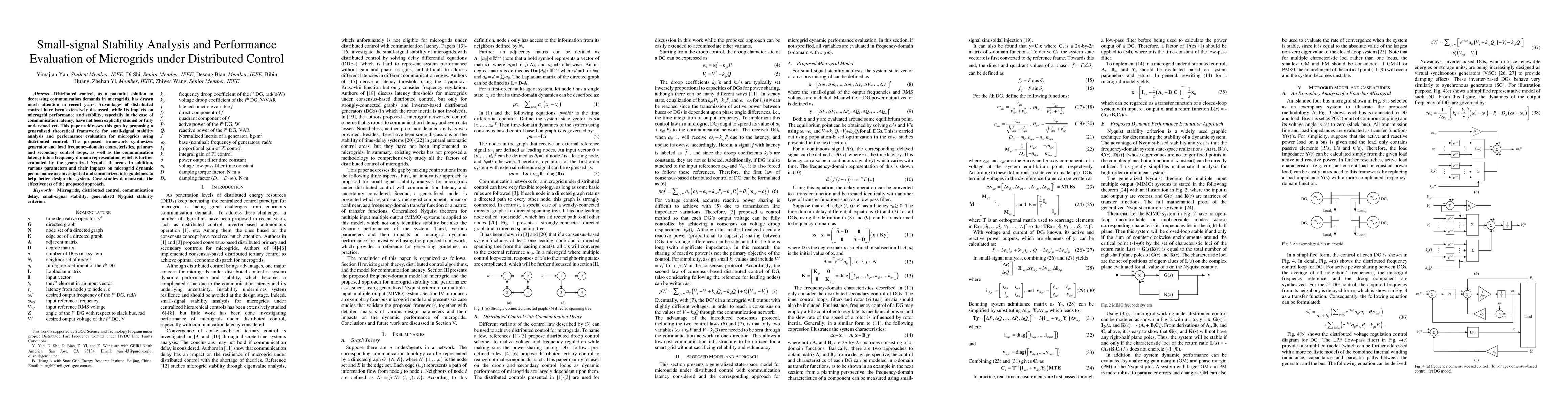 This paper proposes a theoretical framework for analyzing small-signal stability and performance in microgrids under distributed control, integrating frequency-domain characteristics and communication latency. The study provides guidelines for system design and validates the approach through case studies.
