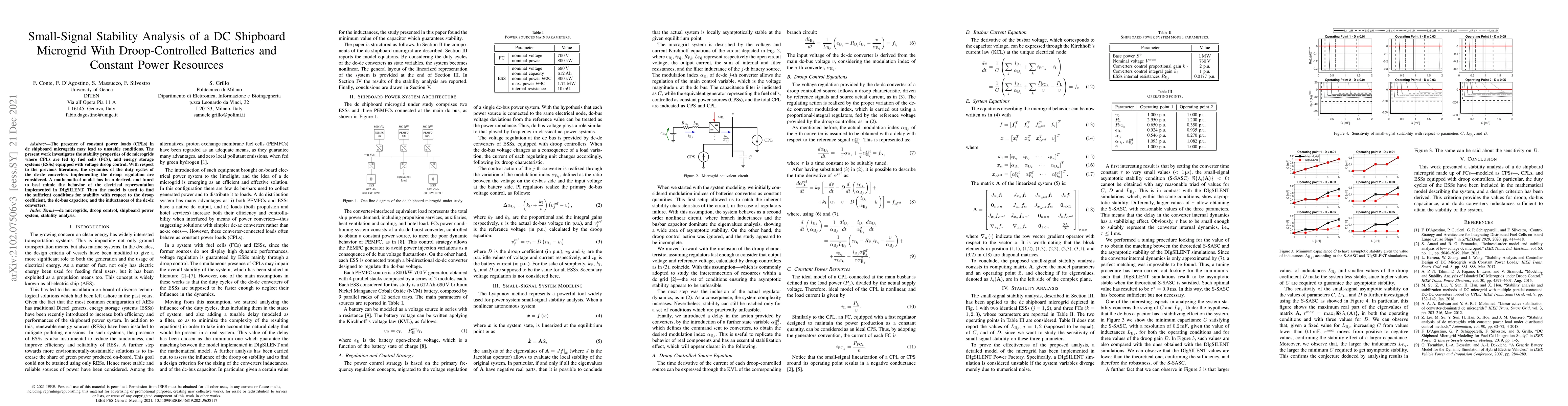This paper analyzes the small-signal stability of a DC shipboard microgrid with constant power loads, fuel cells, and droop-controlled batteries. It derives a mathematical model to determine stability conditions based on droop coefficient, dc-bus capacitor, and converter inductances.