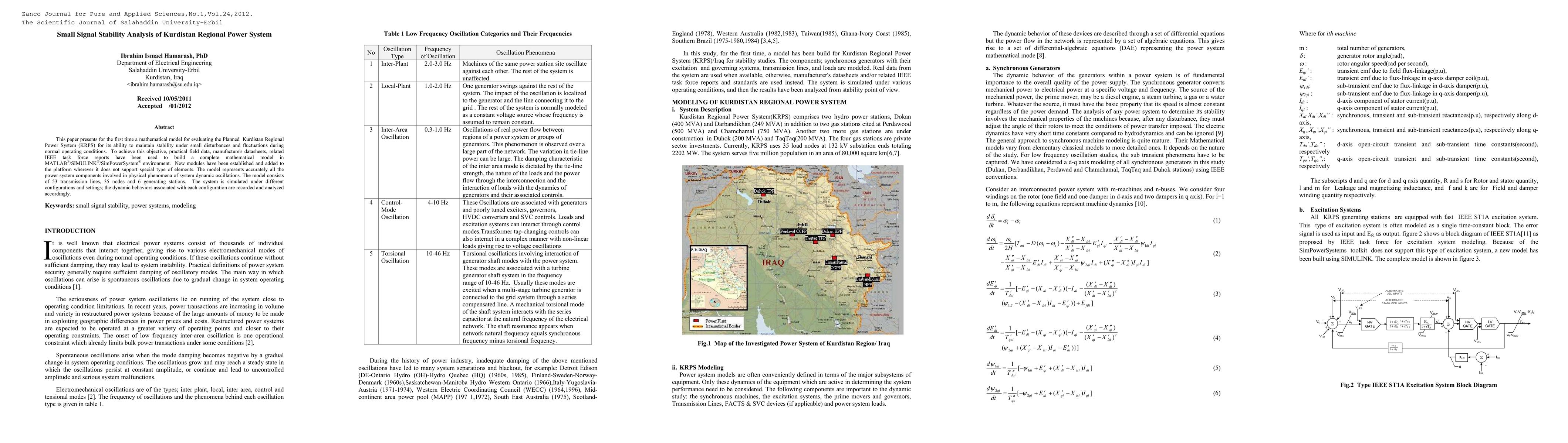 This research is novel as it provides the first small signal stability analysis of the isolated Kurdistan Regional Power System, using a detailed and accurate mathematical model developed from practical data and industry standards.
