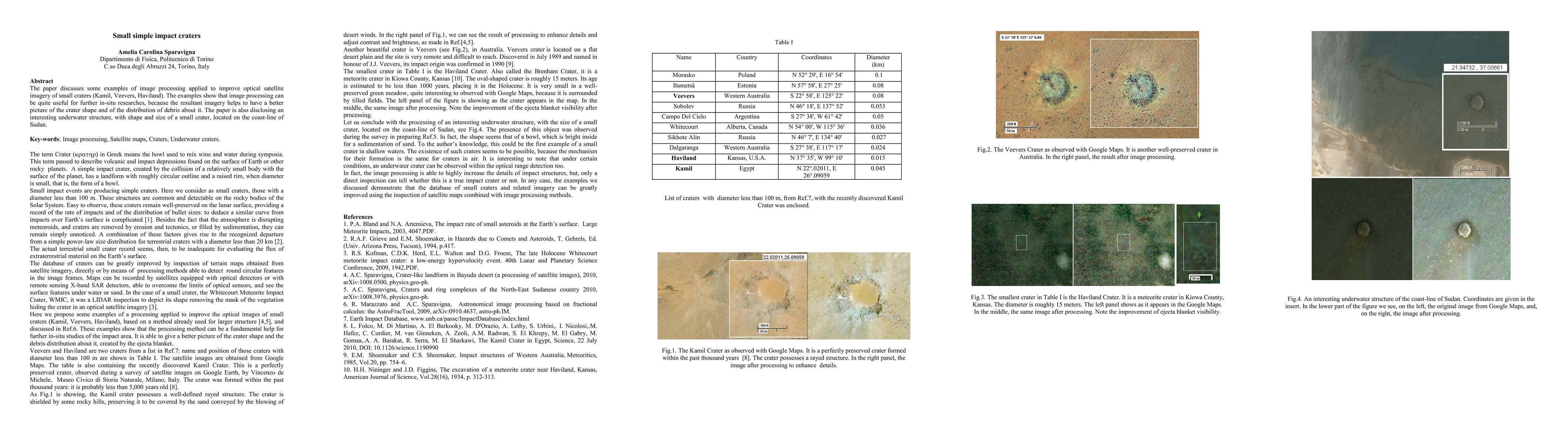 The paper discusses some examples of image processing applied to improve optical satellite imagery of small craters (Kamil, Veevers, Haviland). The examples show that image processing can be quite useful for further in-situ researches, because the resultant imagery helps to have a better picture of the crater shape and of the distribution of debris about it. The paper is also disclosing an interesting underwater structure, with shape and size of a small crater, located on the coast-line of Sudan.