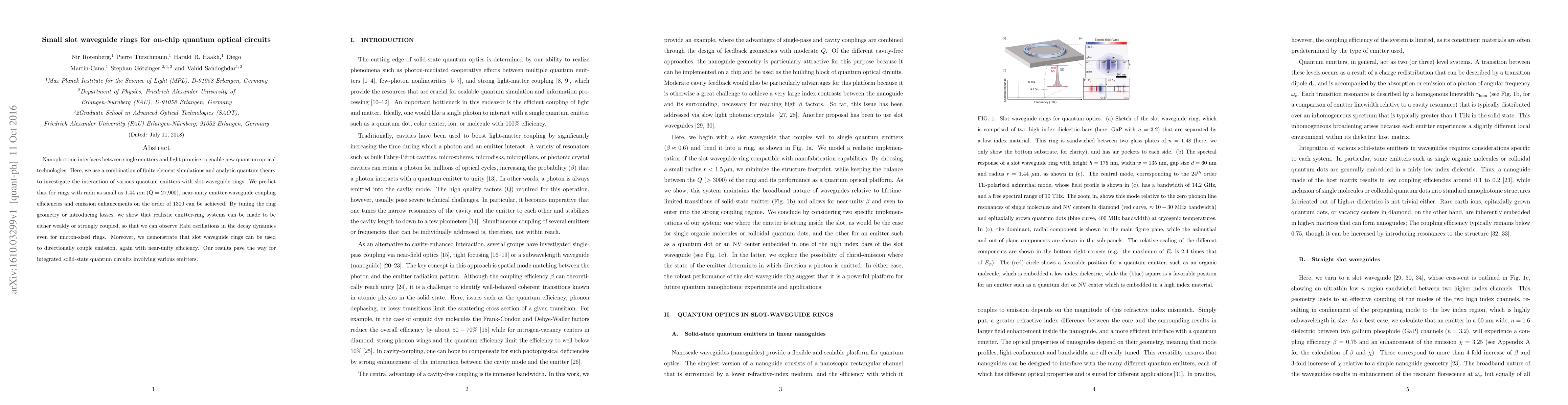 This paper investigates the interaction of quantum emitters with small slot waveguide rings, achieving near-unity coupling efficiencies and emission enhancements of up to 1300, enabling potential for integrated solid-state quantum circuits. The study also demonstrates directionality in coupling and the possibility of observing Rabi oscillations in micron-sized rings.