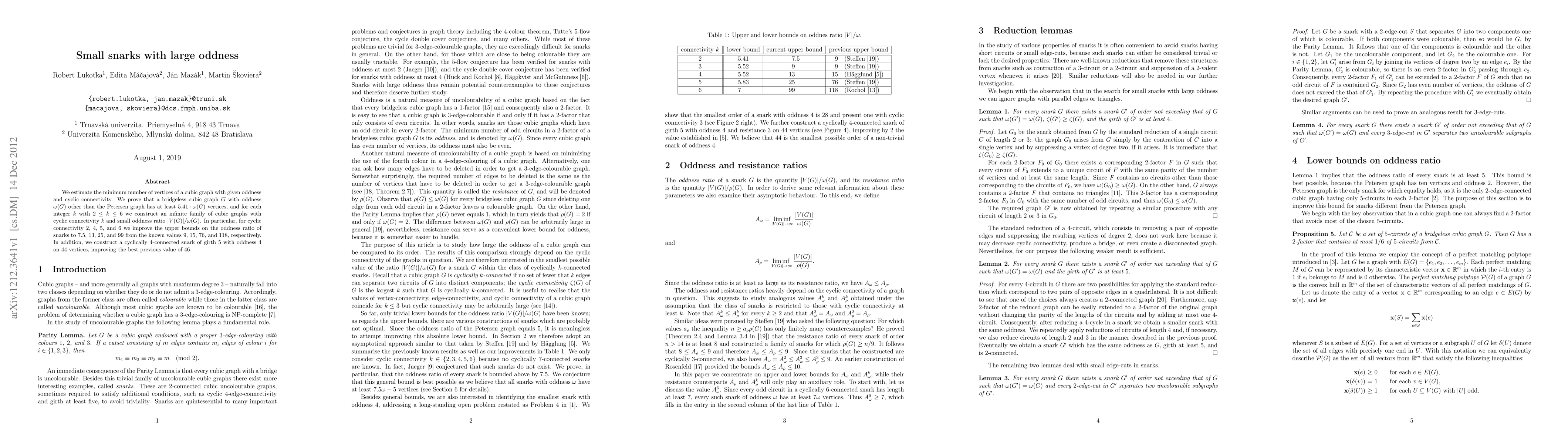 The paper introduces new methods for estimating the minimum number of vertices in cubic graphs with specified oddness and cyclic connectivity, along with improved upper bounds for snark oddness ratios.