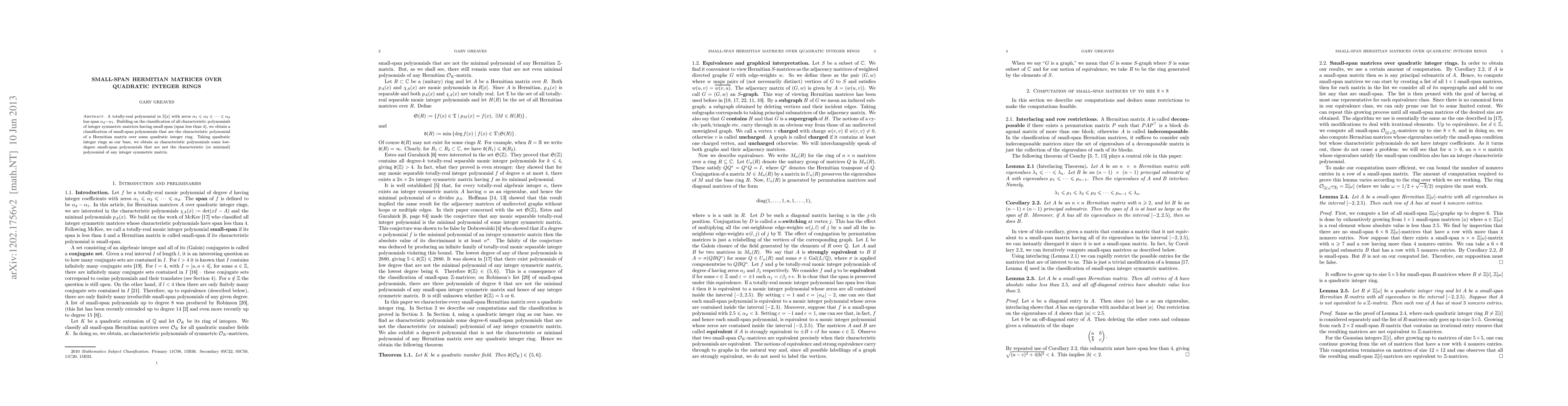 Building on the classification of all characteristic polynomials of integer symmetric matrices having small span (span less than 4), we obtain a classification of small-span polynomials that are the characteristic polynomial of a Hermitian matrix over some quadratic integer ring. Taking quadratic integer rings as our base, we obtain as characteristic polynomials some low-degree small-span polynomials that are not the characteristic (or minimal) polynomial of any integer symmetric matrix.