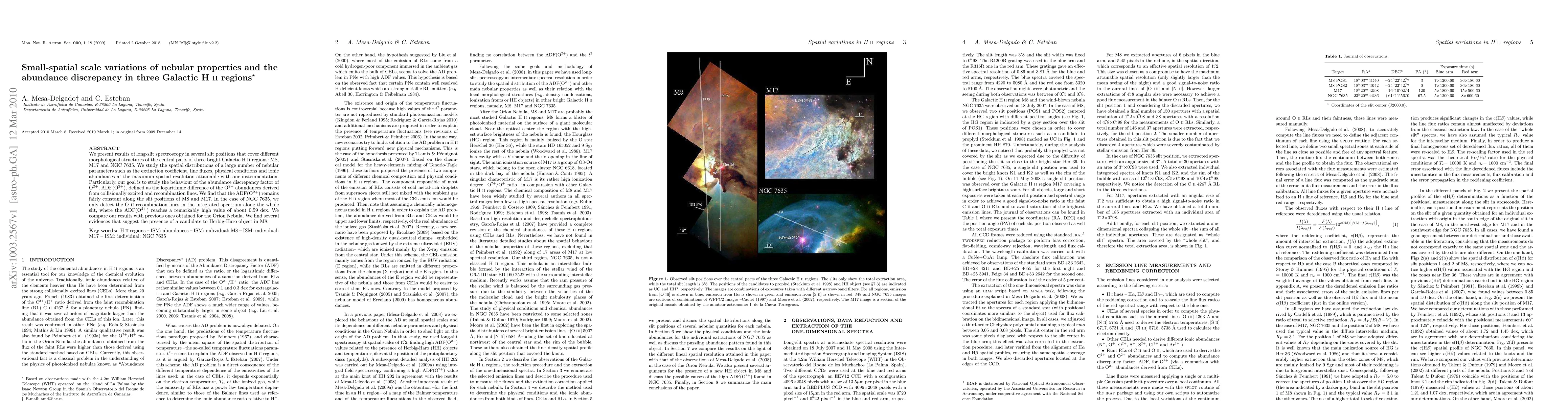 This paper investigates the small-scale variations in nebular properties across three Galactic HII regions (M8, M17, and NGC7635) using high-resolution spectroscopy. The study finds that the abundance discrepancy factor for O^{2+} remains consistent in M8 and M17, but shows a significant increase in NGC7635, suggesting different physical processes at play.
