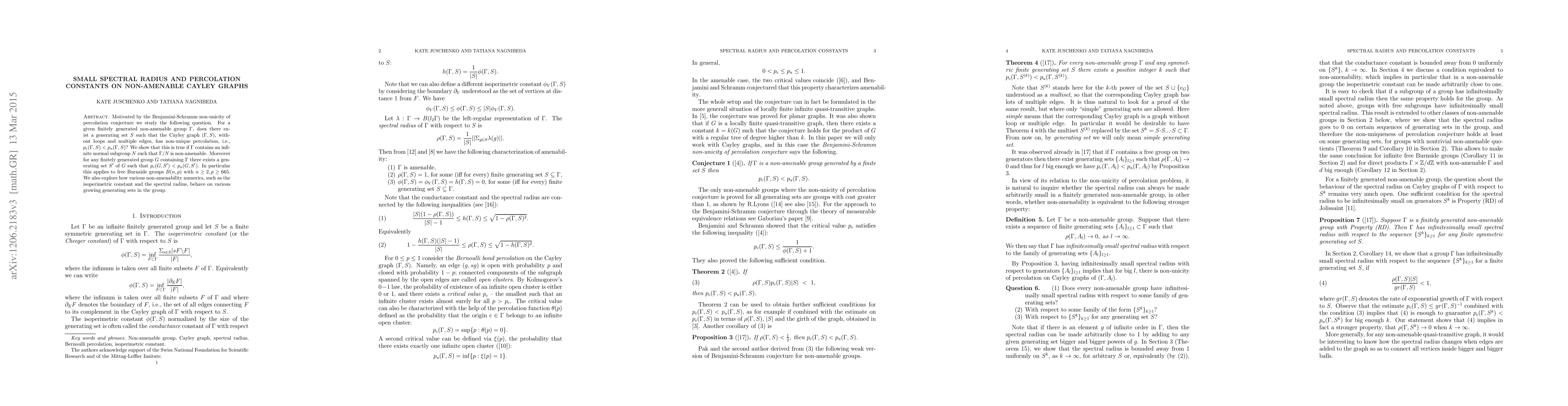 This paper investigates whether non-unique percolation exists on Cayley graphs of non-amenable groups, showing it occurs if the group contains an infinite normal subgroup with a non-amenable quotient. It also applies these findings to free Burnside groups and examines the behavior of non-amenability metrics like the spectral radius.
