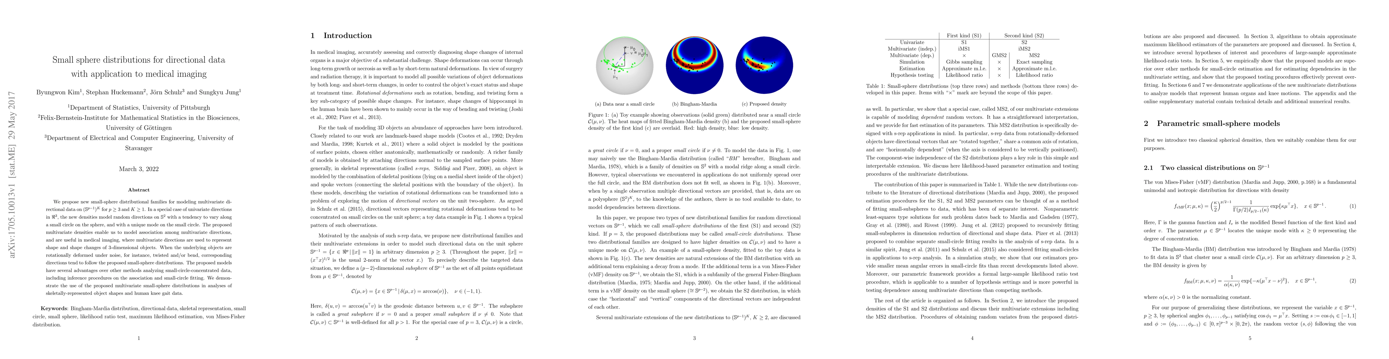 We propose new small-sphere distributional families for modeling multivariate directional data on $(\mathbb{S}^{p-1})^K$ for $p \ge 3$ and $K \ge 1$. In a special case of univariate directions in $\Re^3$, the new densities model random directions on $\mathbb{S}^2$ with a tendency to vary along a small circle on the sphere, and with a unique mode on the small circle. The proposed multivariate densities enable us to model association among multivariate directions, and are useful in medical imaging, where multivariate directions are used to represent shape and shape changes of 3-dimensional objects. When the underlying objects are rotationally deformed under noise, for instance, twisted and/or bend, corresponding directions tend to follow the proposed small-sphere distributions. The proposed models have several advantages over other methods analyzing small-circle-concentrated data, including inference procedures on the association and small-circle fitting. We demonstrate the use of the proposed multivariate small-sphere distributions in analyses of skeletally-represented object shapes and human knee gait data.
