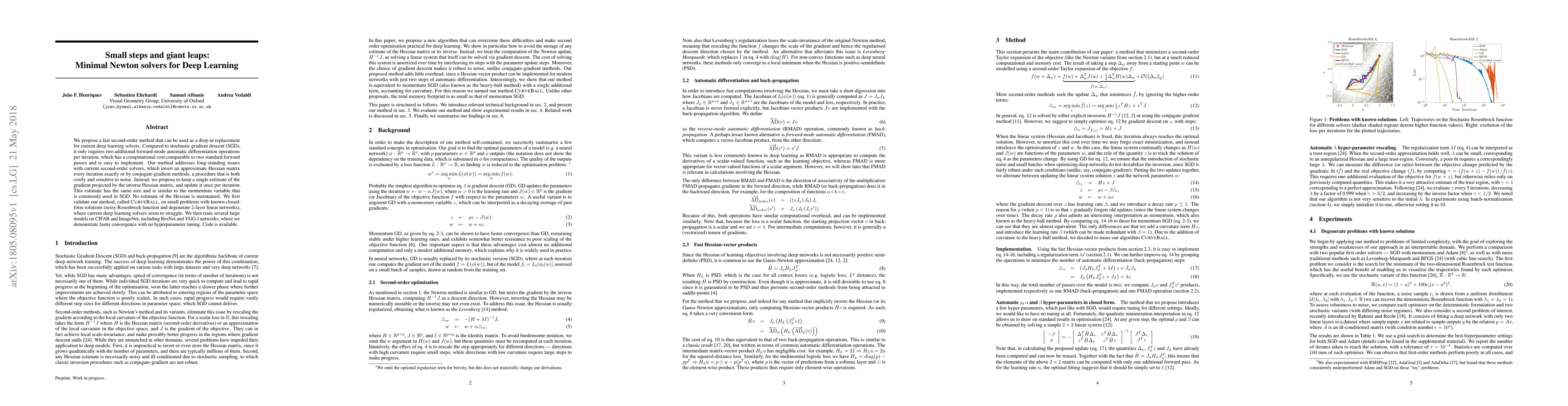 We propose a fast second-order method that can be used as a drop-in replacement for current deep learning solvers. Compared to stochastic gradient descent (SGD), it only requires two additional forward-mode automatic differentiation operations per iteration, which has a computational cost comparable to two standard forward passes and is easy to implement. Our method addresses long-standing issues with current second-order solvers, which invert an approximate Hessian matrix every iteration exactly or by conjugate-gradient methods, a procedure that is both costly and sensitive to noise. Instead, we propose to keep a single estimate of the gradient projected by the inverse Hessian matrix, and update it once per iteration. This estimate has the same size and is similar to the momentum variable that is commonly used in SGD. No estimate of the Hessian is maintained. We first validate our method, called CurveBall, on small problems with known closed-form solutions (noisy Rosenbrock function and degenerate 2-layer linear networks), where current deep learning solvers seem to struggle. We then train several large models on CIFAR and ImageNet, including ResNet and VGG-f networks, where we demonstrate faster convergence with no hyperparameter tuning. Code is available.