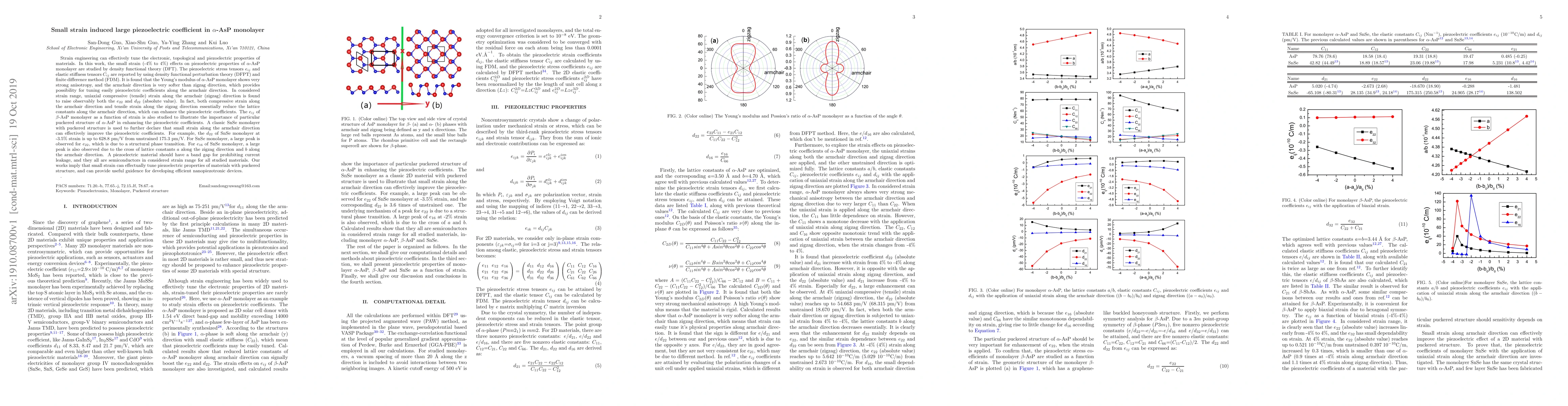 Strain engineering can effectively tune the electronic, topological and piezoelectric properties of materials. In this work, the small strain (-4\% to 4\%) effects on piezoelectric properties of $\alpha$-AsP monolayer are studied by density functional theory (DFT). The piezoelectric stress tensors $e_{ij}$ and elastic stiffness tensors $C_{ij}$ are reported by using density functional perturbation theory (DFPT) and finite difference method (FDM). It is found that the Young's modulus of $\alpha$-AsP monolayer shows very strong anisotropy, and the armchair direction is very softer than zigzag direction, which provides possibility for tuning easily piezoelectric coefficients along the armchair direction. In considered strain range, uniaxial compressive (tensile) strain along the armchair (zigzag) direction is found to raise observably both the $e_{22}$ and $d_{22}$ (absolute value). In fact, both compressive strain along the armchair direction and tensile strain along the zigzag direction essentially reduce the lattice constants along the armchair direction, which can enhance the piezoelectric coefficients. The $e_{ij}$ of $\beta$-AsP monolayer as a function of strain is also studied to illustrate the importance of particular puckered structure of $\alpha$-AsP in enhancing the piezoelectric coefficients. A classic SnSe monolayer with puckered structure is used to further declare that small strain along the armchair direction can effectively improve the piezoelectric coefficients. For example, the $d_{22}$ of SnSe monolayer at -3.5\% strain is up to 628.8 pm/V from unstrained 175.3 pm/V. For SnSe monolayer, a large peak is observed for $e_{22}$, which is due to a structural phase transition. For $e_{16}$ of SnSe monolayer, a large peak is also observed due to the cross of lattice constants $a$ along the zigzag direction and $b$ along the armchair direction.