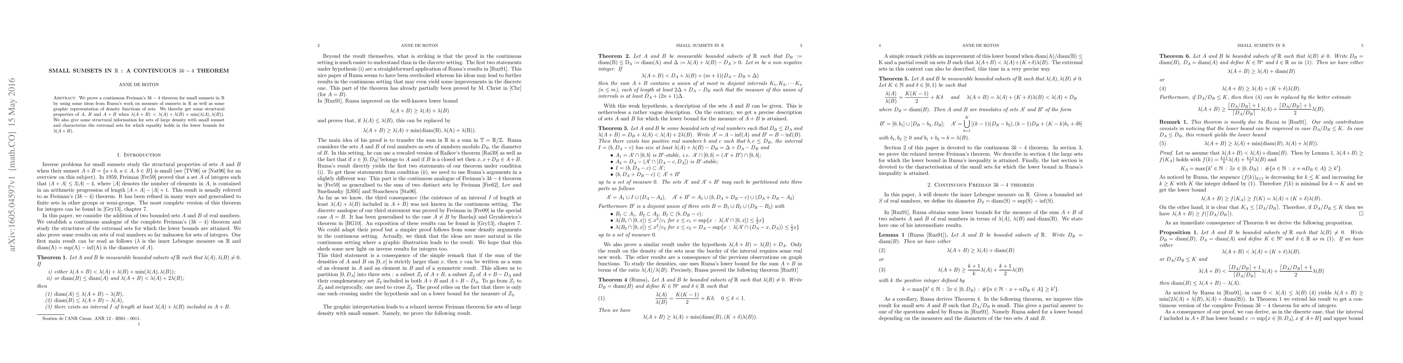 This paper proves a continuous version of Freiman's 3k-4 theorem for small sumsets in the real line, providing structural properties of sets and their sums under certain conditions.