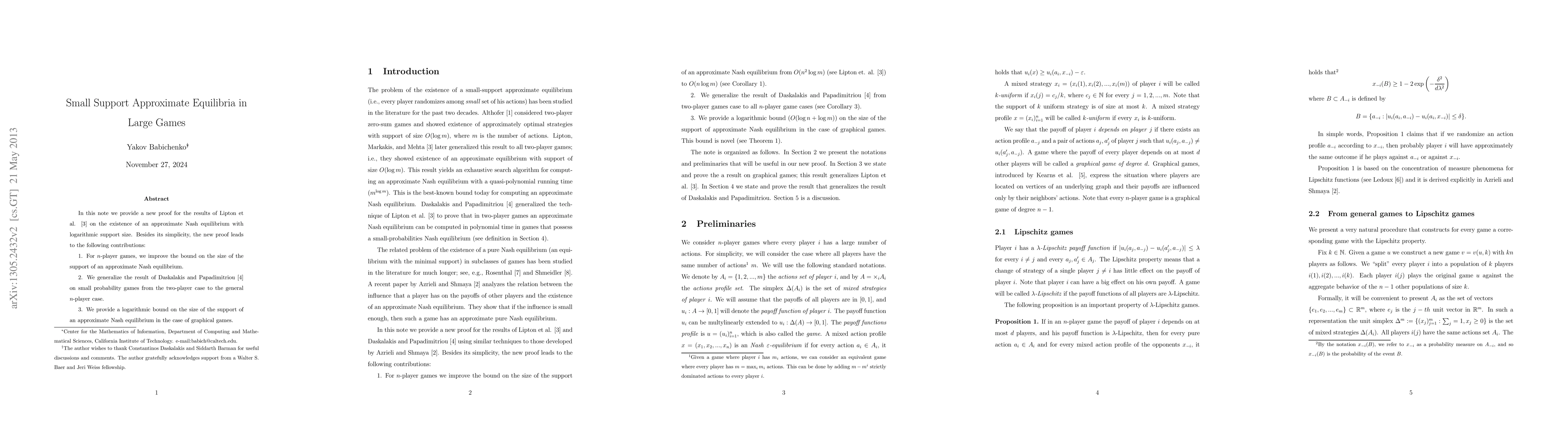 This paper proves the existence of an approximate Nash equilibrium with a logarithmic support size in large games, improving previous bounds and generalizing to n-player cases.