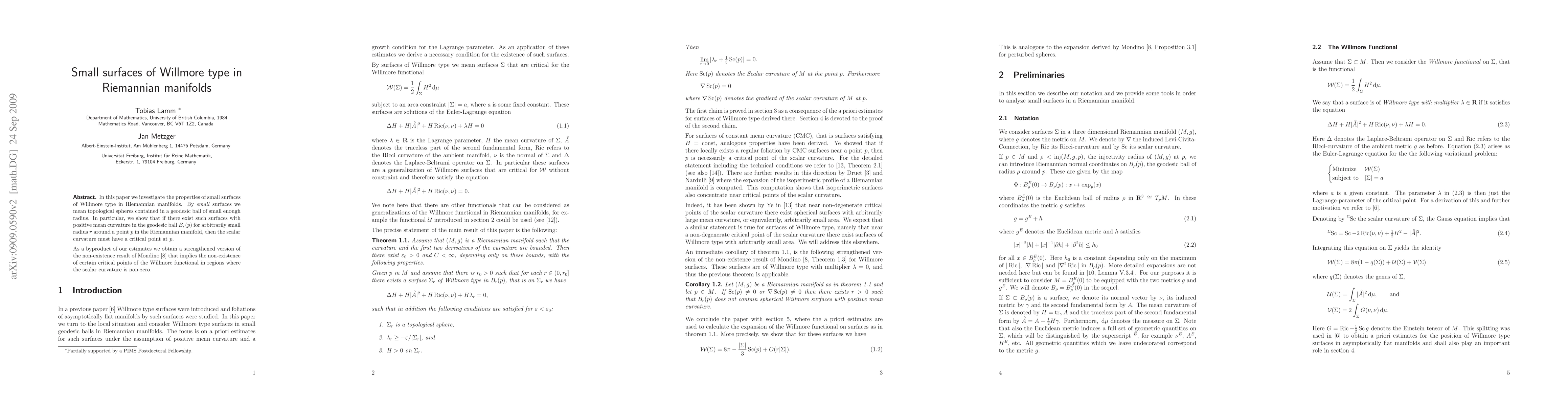In this paper we investigate the properties of small surfaces of Willmore type in Riemannian manifolds. By \emph{small} surfaces we mean topological spheres contained in a geodesic ball of small enough radius. In particular, we show that if there exist such surfaces with positive mean curvature in the geodesic ball $B_r(p)$ for arbitrarily small radius $r$ around a point $p$ in the Riemannian manifold, then the scalar curvature must have a critical point at $p$. As a byproduct of our estimates we obtain a strengthened version of the non-existence result of Mondino \cite{Mondino:2008} that implies the non-existence of certain critical points of the Willmore functional in regions where the scalar curvature is non-zero.