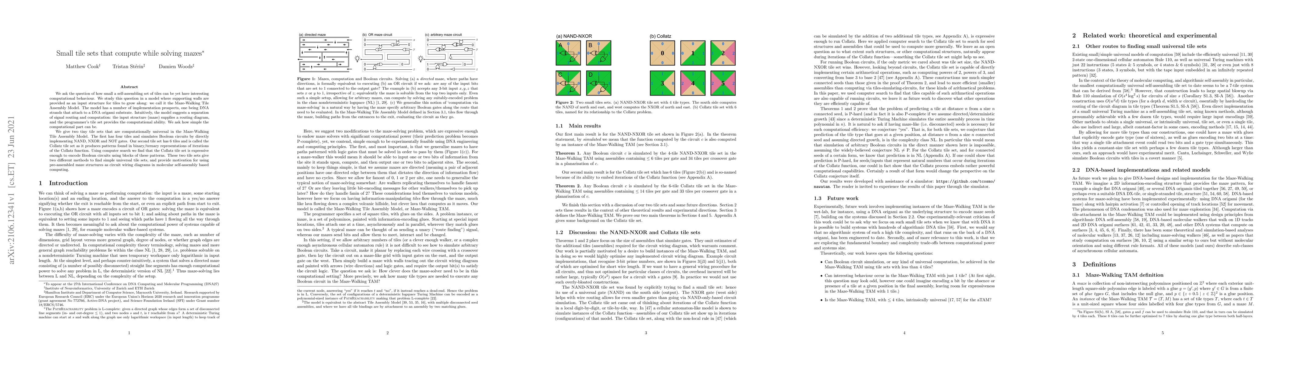 We ask the question of how small a self-assembling set of tiles can be yet have interesting computational behaviour. We study this question in a model where supporting walls are provided as an input structure for tiles to grow along: we call it the Maze-Walking Tile Assembly Model. The model has a number of implementation prospects, one being DNA strands that attach to a DNA origami substrate. Intuitively, the model suggests a separation of signal routing and computation: the input structure (maze) supplies a routing diagram, and the programmer's tile set provides the computational ability. We ask how simple the computational part can be. We give two tiny tile sets that are computationally universal in the Maze-Walking Tile Assembly Model. The first has four tiles and simulates Boolean circuits by directly implementing NAND, NXOR and NOT gates. Our second tile set has 6 tiles and is called the Collatz tile set as it produces patterns found in binary/ternary representations of iterations of the Collatz function. Using computer search we find that the Collatz tile set is expressive enough to encode Boolean circuits using blocks of these patterns. These two tile sets give two different methods to find simple universal tile sets, and provide motivation for using pre-assembled maze structures as circuit wiring diagrams in molecular self-assembly based computing.