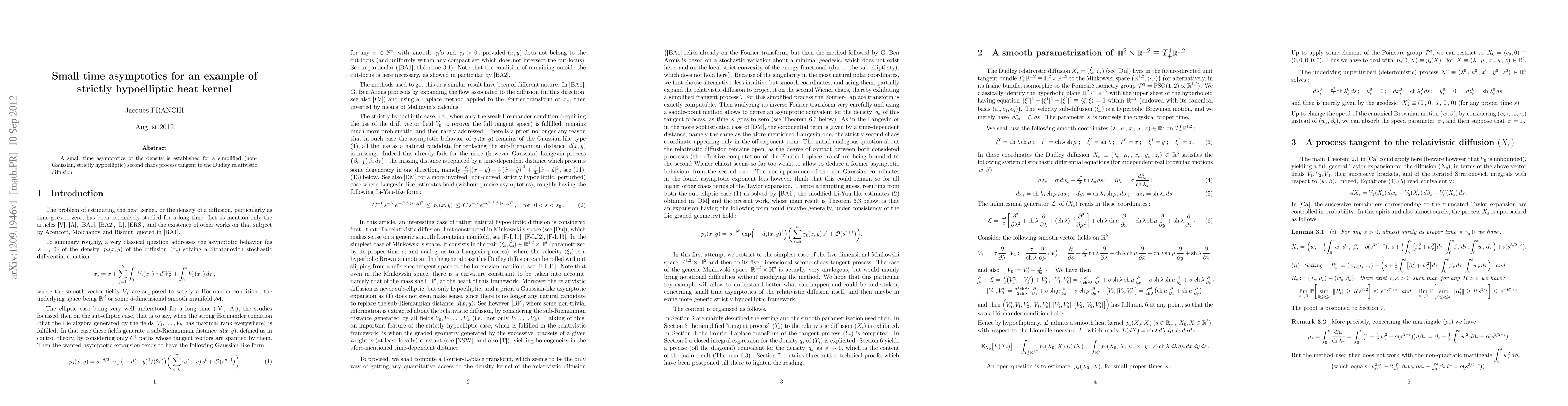 Summary: This paper establishes the small time asymptotic behavior of a non-Gaussian, strictly hypoelliptic heat kernel density for a second-order process related to Dudley's relativistic diffusion. The findings provide insights into the behavior of such hypoelliptic processes at early times.