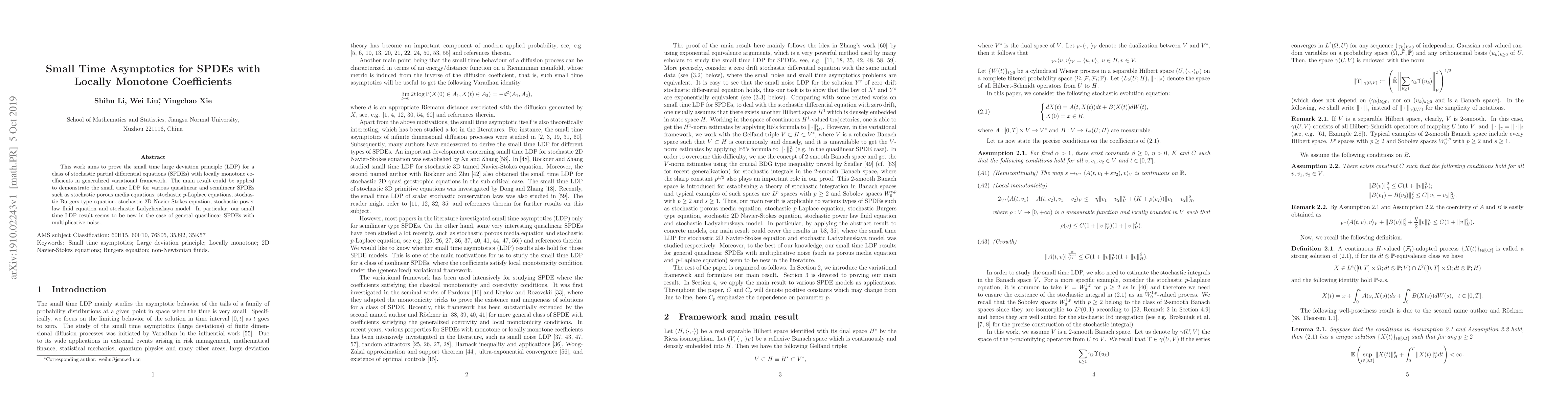 This work aims to prove the small time large deviation principle (LDP) for a class of stochastic partial differential equations (SPDEs) with locally monotone coefficients in generalized variational framework. The main result could be applied to demonstrate the small time LDP for various quasilinear and semilinear SPDEs such as stochastic porous media equations, stochastic $p$-Laplace equations, stochastic Burgers type equation, stochastic 2D Navier-Stokes equation, stochastic power law fluid equation and stochastic Ladyzhenskaya model. In particular, our small time LDP result seems to be new in the case of general quasilinear SPDEs with multiplicative noise.