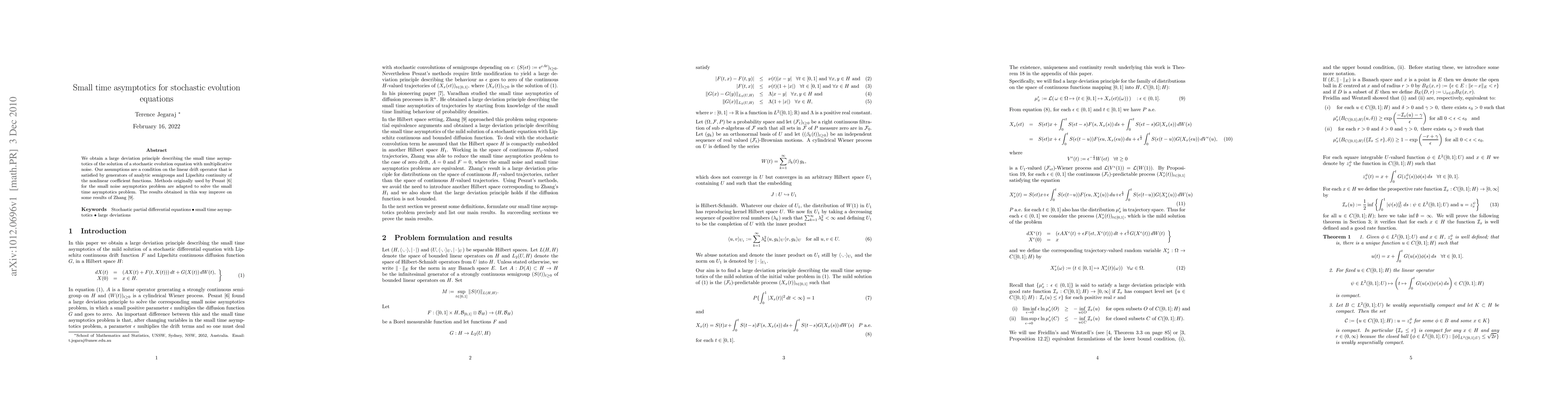 We obtain a large deviation principle describing the small time asymptotics of the solution of a stochastic evolution equation with multiplicative noise. Our assumptions are a condition on the linear drift operator that is satisfied by generators of analytic semigroups and Lipschitz continuity of the nonlinear drift and dispersion coefficients. Methods originally used by Szymon Peszat for the small noise asymptotics problem are adapted to solve the small time asymptotics problem.