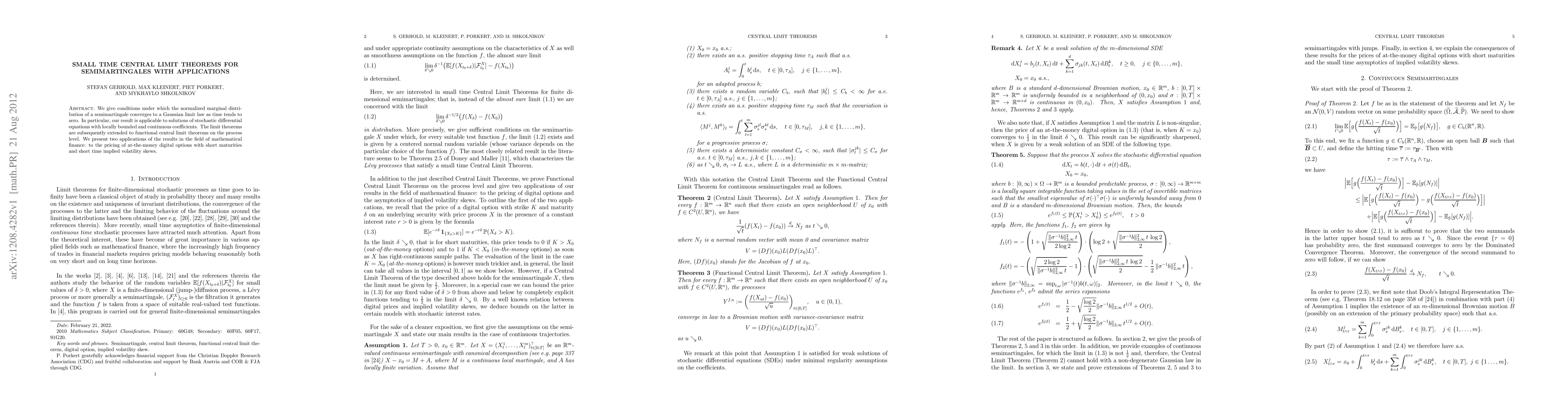 This paper establishes small time central limit theorems for semimartingales, showing their normalized marginal distributions converge to Gaussian laws as time approaches zero. The findings are applied to stochastic differential equations and have implications for the pricing of at-the-money digital options in mathematical finance.