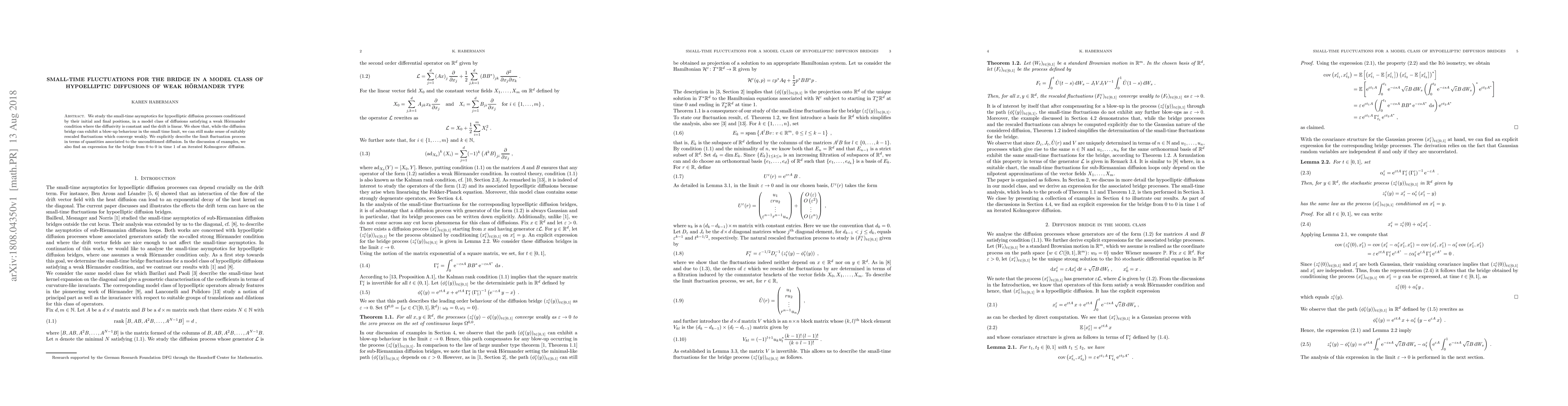 We study the small-time asymptotics for hypoelliptic diffusion processes conditioned by their initial and final positions, in a model class of diffusions satisfying a weak H\"ormander condition where the diffusivity is constant and the drift is linear. We show that, while the diffusion bridge can exhibit a blow-up behaviour in the small time limit, we can still make sense of suitably rescaled fluctuations which converge weakly. We explicitly describe the limit fluctuation process in terms of quantities associated to the unconditioned diffusion. In the discussion of examples, we also find an expression for the bridge from 0 to 0 in time 1 of an iterated Kolmogorov diffusion.