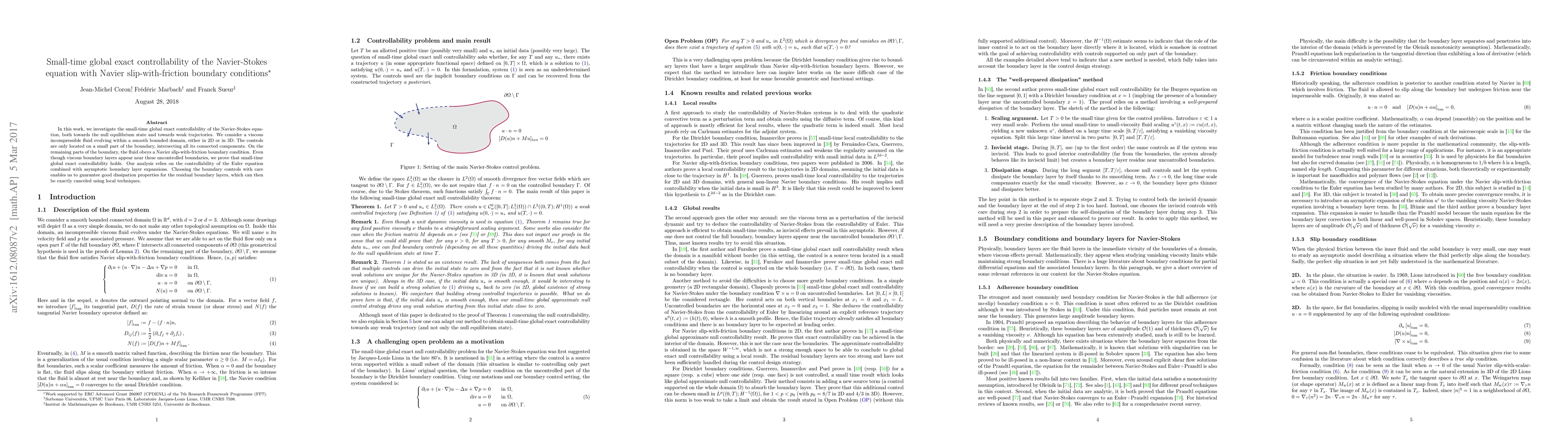 This paper proves the small-time global exact controllability of the Navier-Stokes equation for viscous incompressible fluids under Navier slip-with-friction boundary conditions, even with controls only on a small part of the boundary. The analysis combines Euler equation controllability and boundary layer expansions to achieve this result.