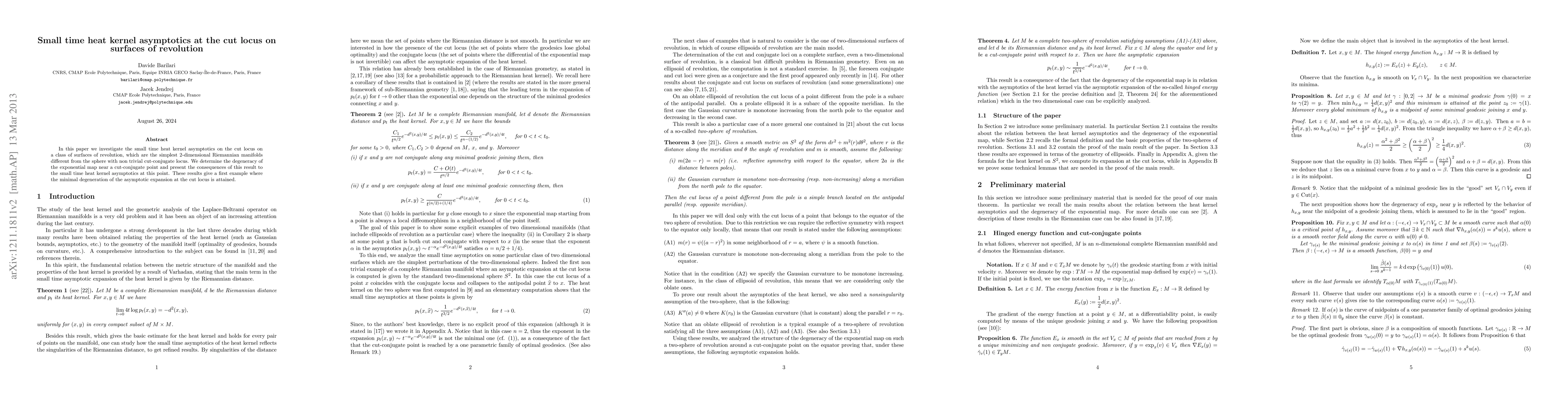 This paper studies the small time behavior of the heat kernel on the cut locus of surfaces of revolution, determining the degeneracy of the exponential map near a cut-conjugate point, and presenting its implications for the heat kernel's asymptotic expansion at this point, marking the first instance of minimal asymptotic expansion degeneracy at the cut locus.