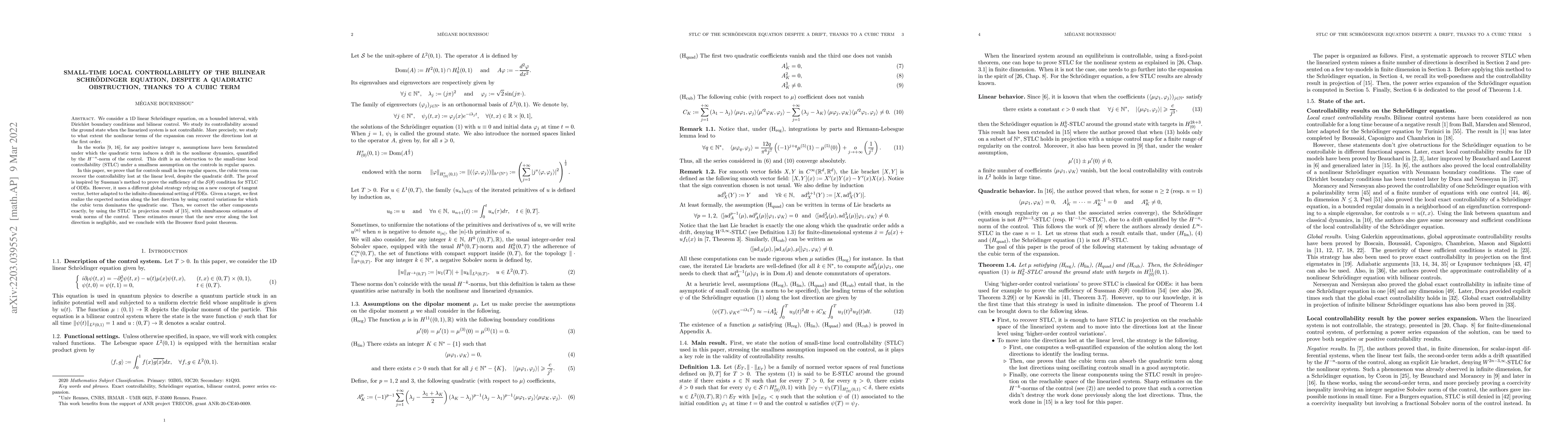 This paper studies small-time local controllability (STLC) for a bilinear Schrödinger equation on a bounded interval, despite a quadratic obstruction. It demonstrates that a cubic term can recover controllability lost at the linear level by using control variations where the cubic term dominates, followed by a correction of other components using STLC projection results and weak norm estimates.