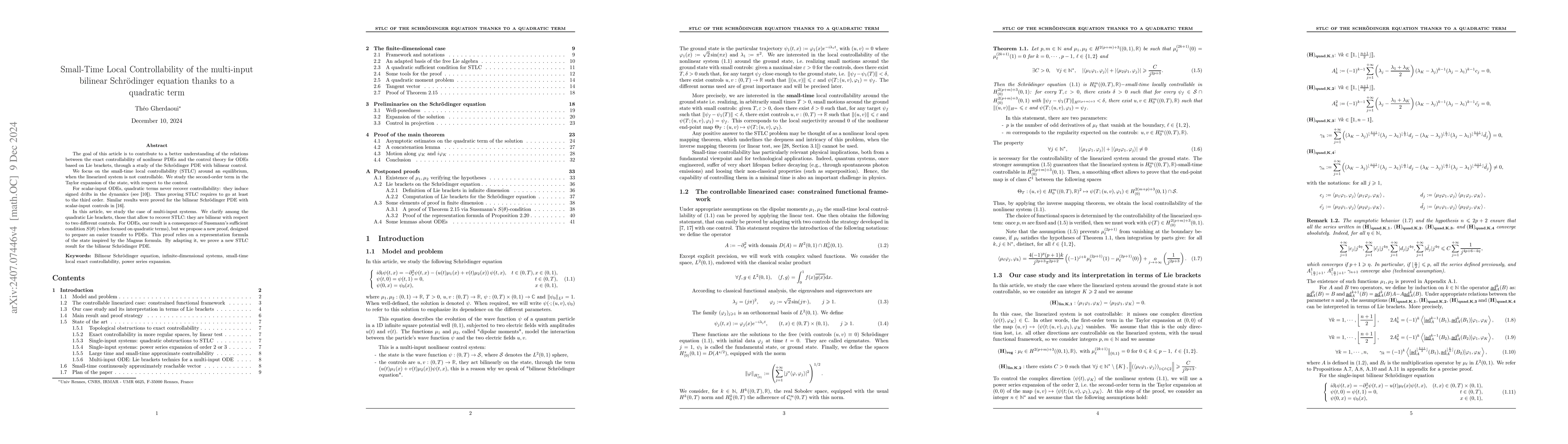 This paper investigates small-time local controllability (STLC) of the multi-input bilinear Schrödinger equation, revealing that quadratic terms in the control dynamics can restore controllability, a phenomenon not observed in scalar-input ODEs. A new proof leveraging a representation formula inspired by the Magnus formula clarifies which quadratic Lie brackets between different controls allow for STLC recovery.