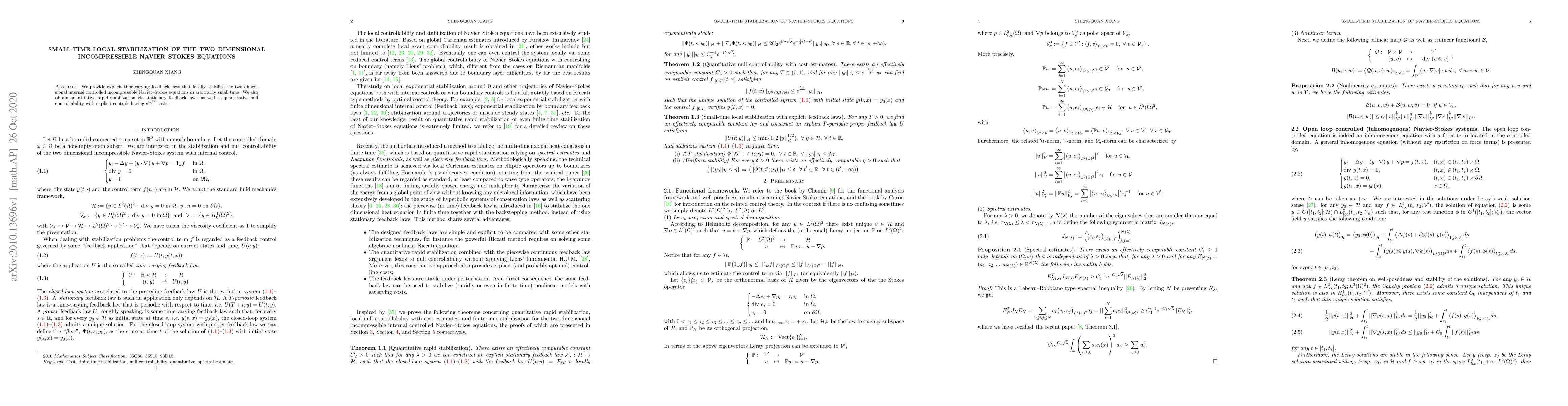 We provide explicit time-varying feedback laws that locally stabilize the two dimensional internal controlled incompressible Navier-Stokes equations in arbitrarily small time. We also obtain quantitative rapid stabilization via stationary feedback laws, as well as quantitative null controllability with explicit controls having $e^{C/T}$ costs.