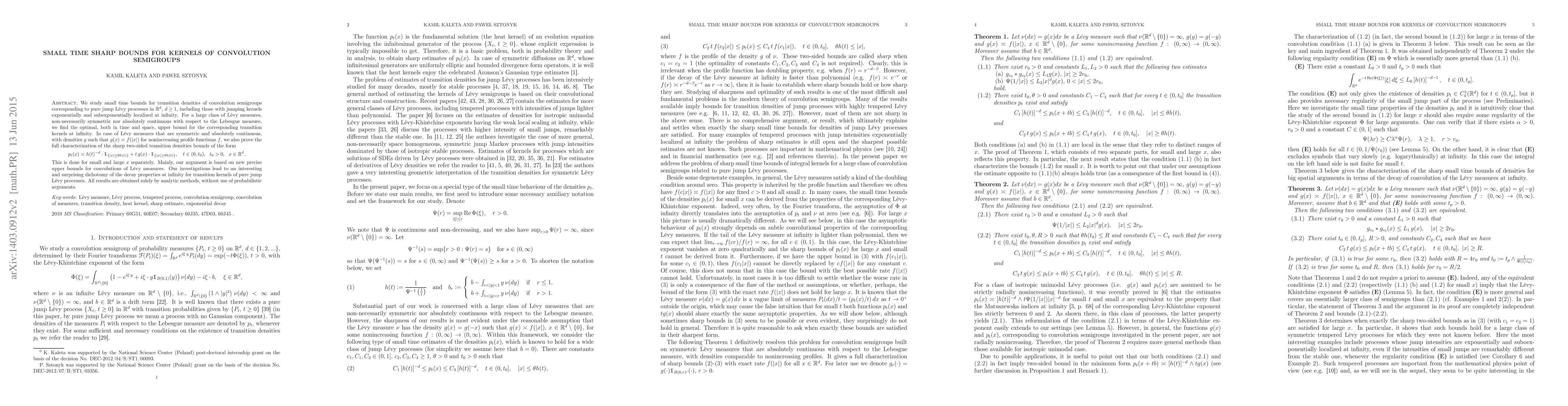 We study small time bounds for transition densities of convolution semigroups corresponding to pure jump L\'evy processes in $\mathbb{R}^{d}$, $d \geq 1$, including those with jumping kernels exponentially and subexponentially localized at infinity. For a large class of L\'evy measures, non-necessarily symmetric nor absolutely continuous with respect to the Lebesgue measure, we find the optimal, both in time and space, upper bound for the corresponding transition kernels at infinity. In case of L\'evy measures that are symmetric and absolutely continuous, with densities $g$ such that $g(x) \asymp f(|x|)$ for nonincreasing profile functions $f$, we also prove the full characterization of the sharp two-sided transition densities bounds of the form $$ p_t(x) \asymp h(t)^{-d} \cdot \mathbf{1}_{\left\{|x|\leq \theta h(t)\right\}} + t \, g(x) \cdot \mathbf{1}_{\left\{|x| \geq \theta h(t)\right\}}, \quad t \in (0,t_0), \ \ t_0>0, \ \ x \in \mathbb{R}^{d}. $$ This is done for small and large $x$ separately. Mainly, our argument is based on new precise upper bounds for convolutions of L\'evy measures. Our investigations lead to an interesting and surprising dichotomy of the decay properties at infinity for transition kernels of pure jump L\'evy processes. All results are obtained solely by analytic methods, without use of probabilistic arguments.