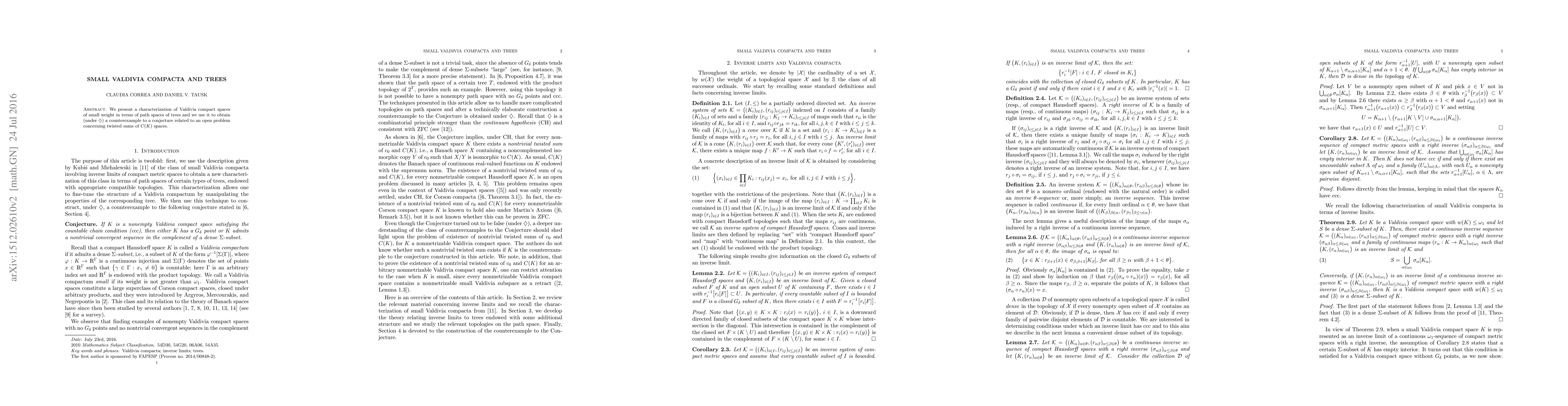 This paper characterizes Valdivia compact spaces with small weight using path spaces of trees and provides a counterexample under the $\diamondsuit$ assumption to a conjecture about twisted sums of $C(K)$ spaces.