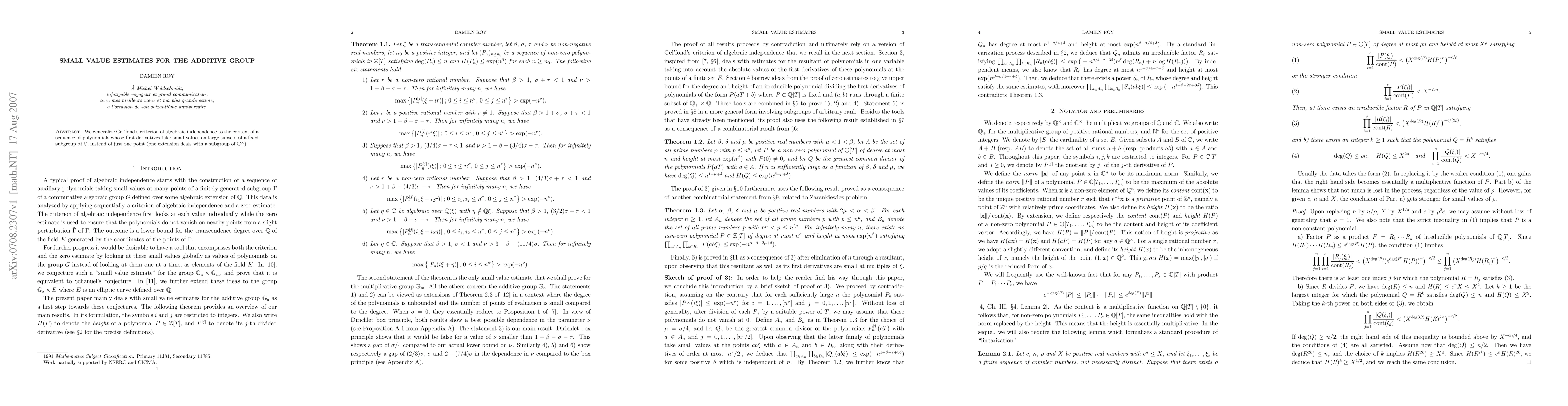 We generalize Gel'fond's criterion of algebraic independence to the context of a sequence of polynomials whose first derivatives take small values on large subsets of a fixed subgroup of the additive group of complex numbers, instead of just one point. We also provide one extension dealing with a subgroup of the multiplicative group of non-zero complex numbers.