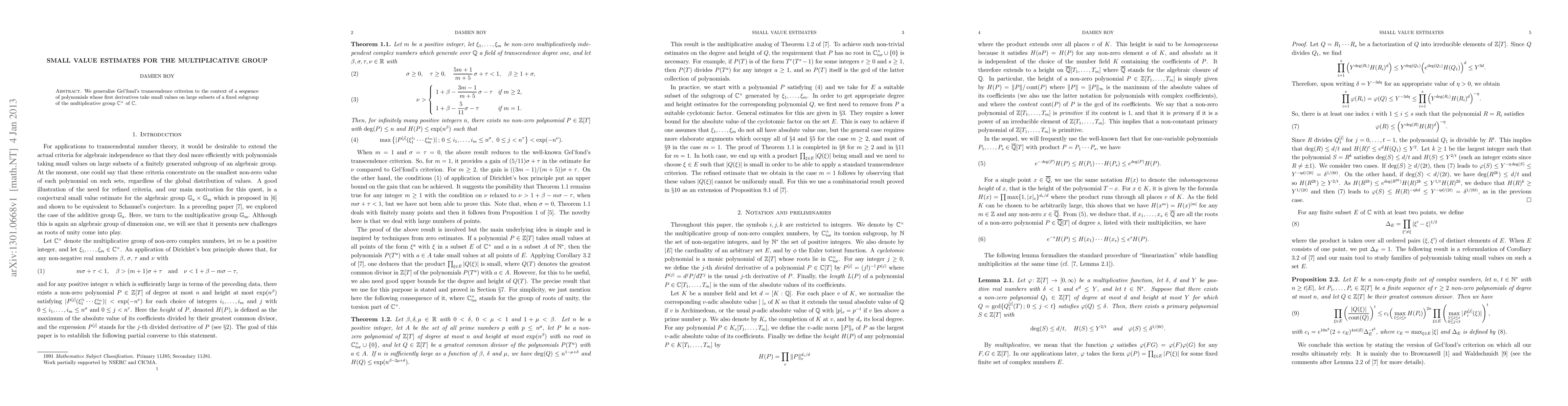 We generalize Gel'fond's transcendence criterion to the context of a sequence of polynomials whose first derivatives take small values on large subsets of a fixed subgroup of the multiplicative group C* of the field of complex numbers.